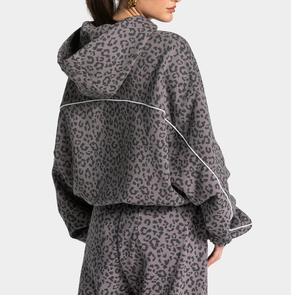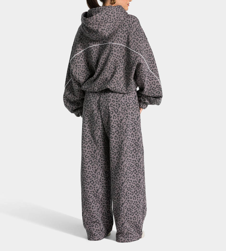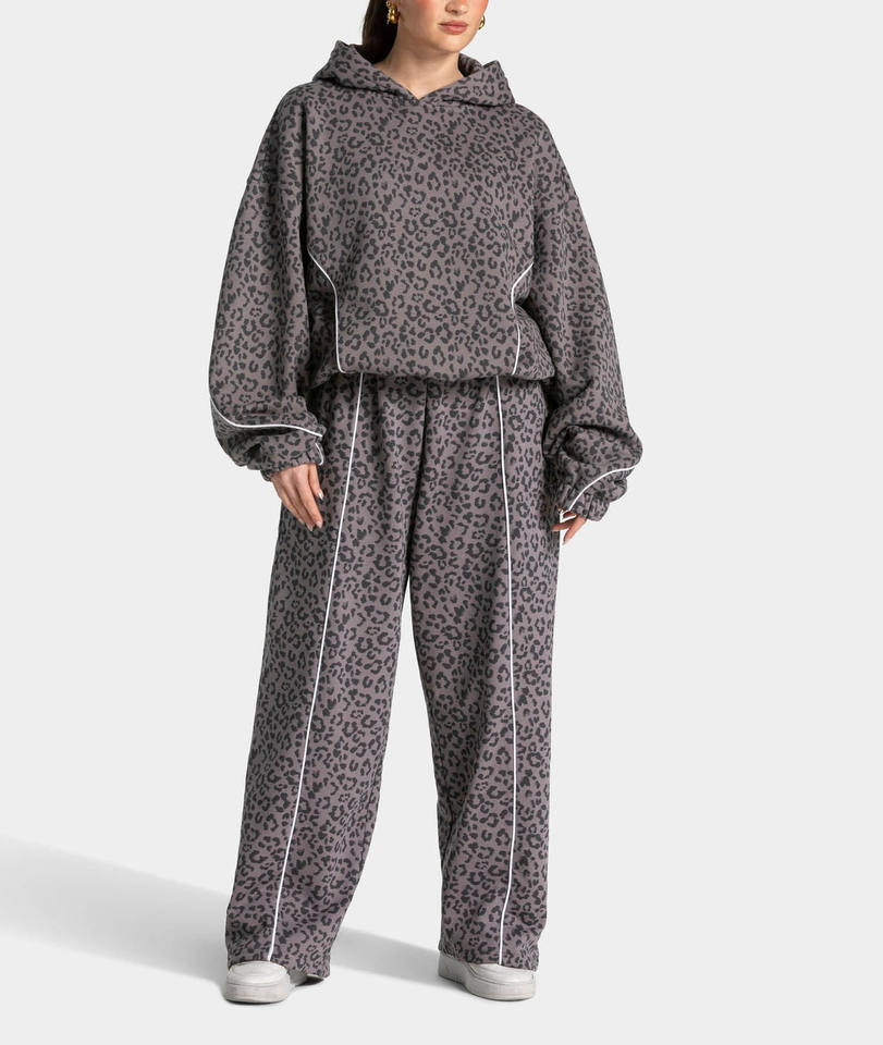 Survêtement femme surdimensionné en graphite imprimé léopard avec passepoil contrastant, comprenant un sweat à capuche et un pantalon de jogging à doublure contrastante