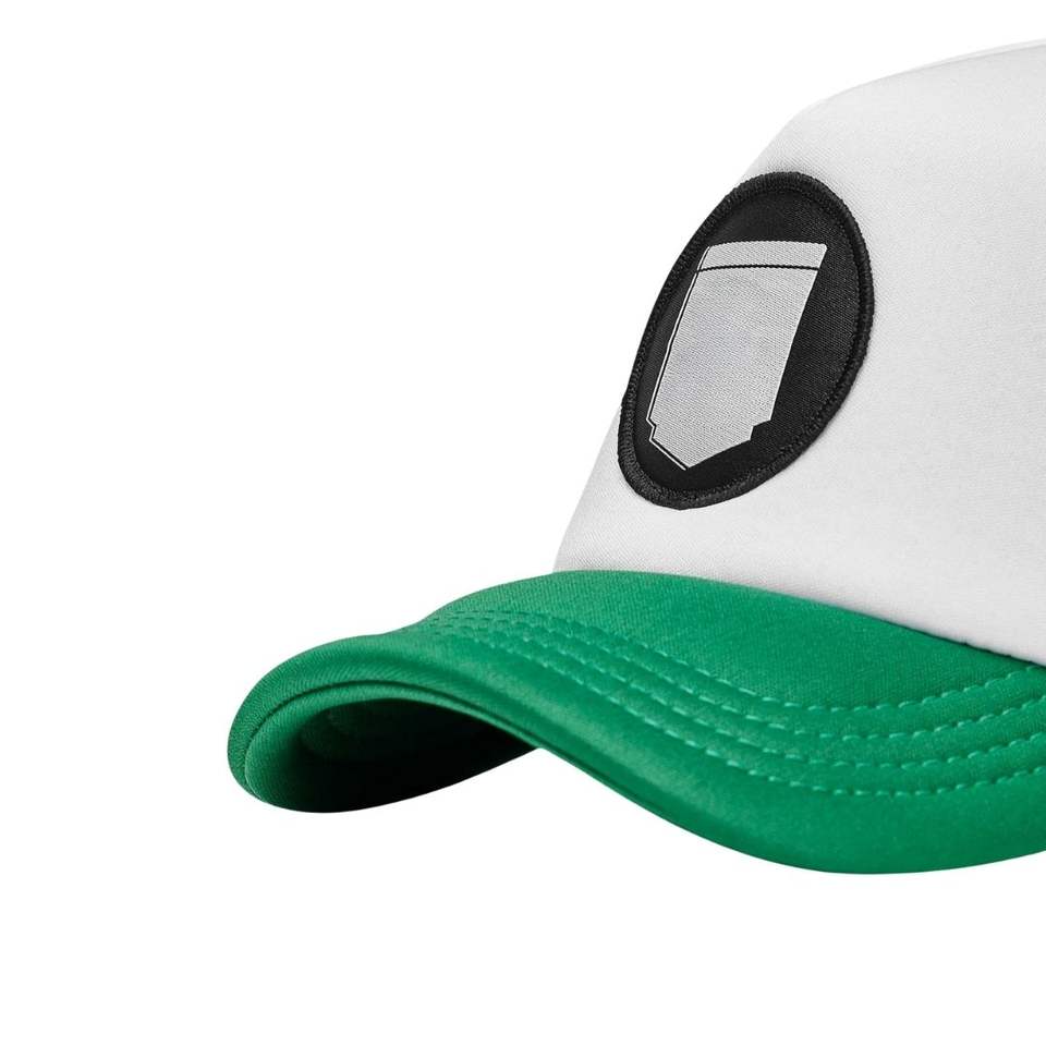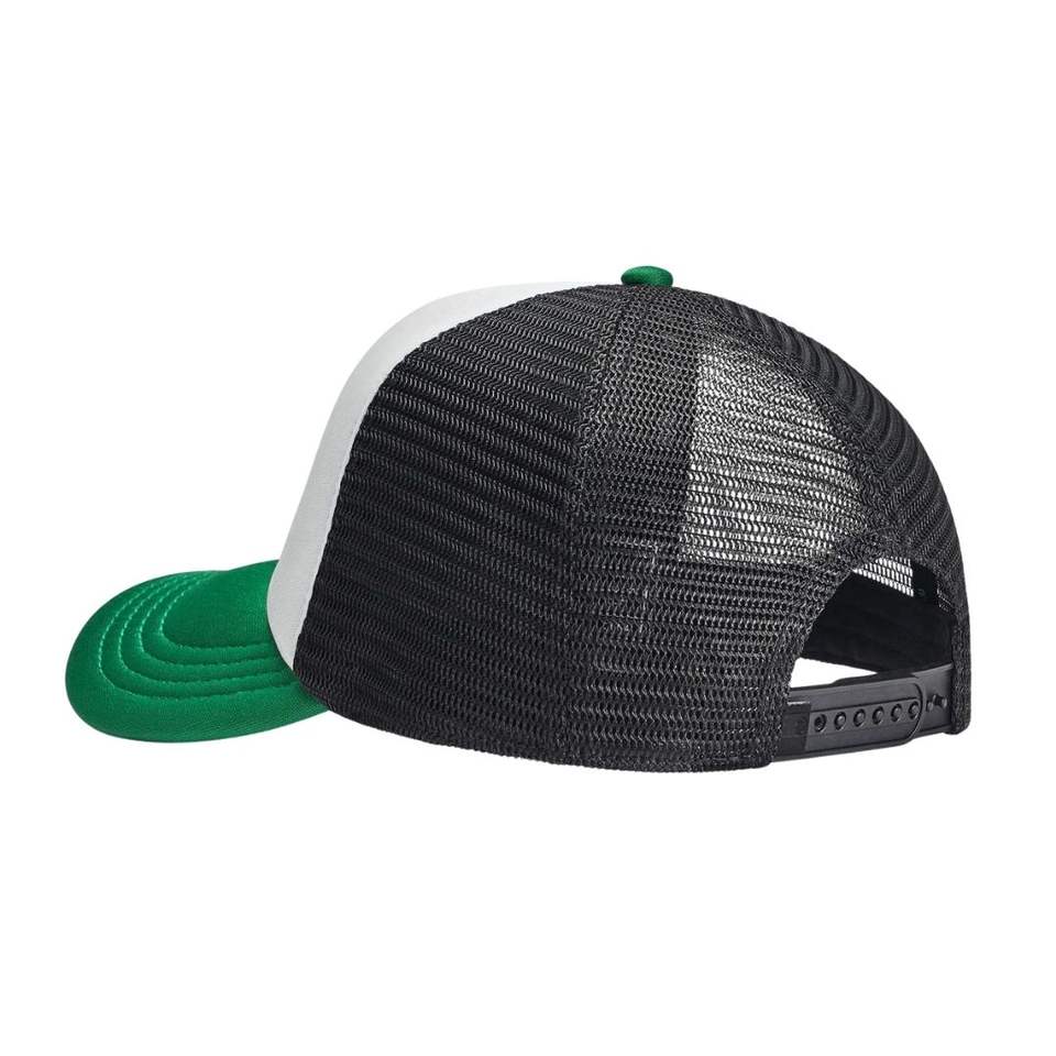 Casquette trucker personnalisée verte et blanche, haute qualité, devant en mousse, dos en mesh, fermeture snapback, pour événements promotionnels, vêtements d'équipe.