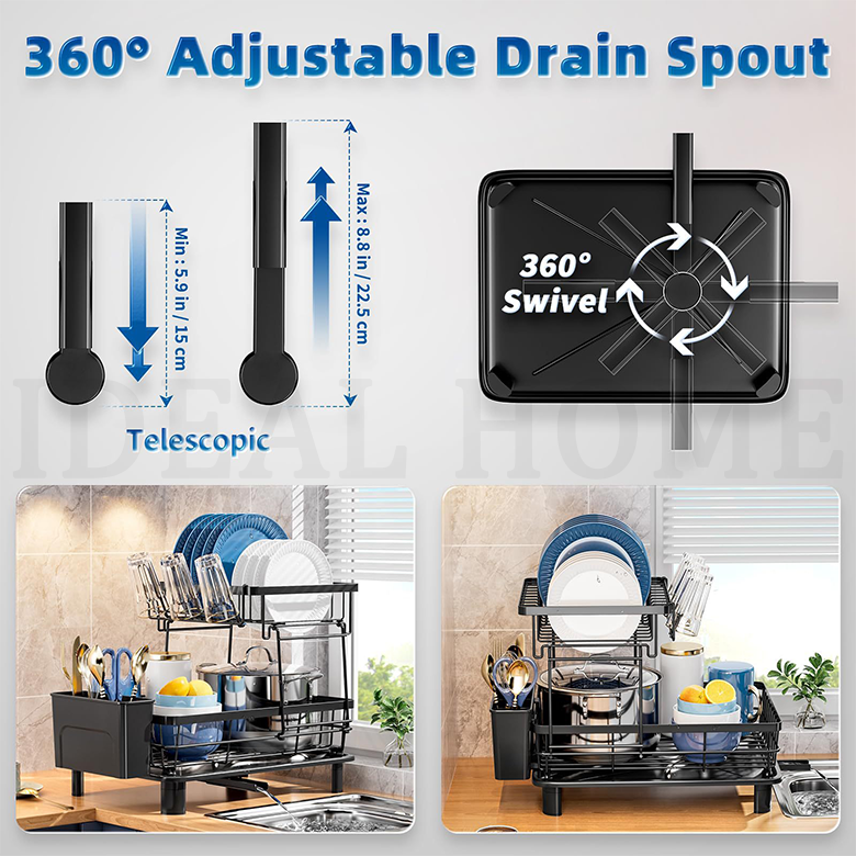 Égouttoir à vaisselle à 2 niveaux en acier au carbone gris personnalisé avec égouttoir automatique pour évier de cuisine avec porte-couteaux, porte-fourchettes et porte-gobelets