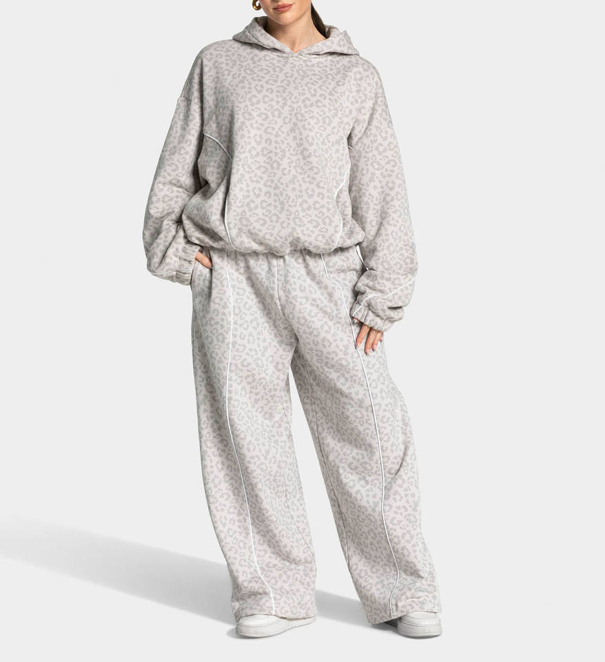 Ensemble survêtement femme gris imprimé léopard surdimensionné avec doublure contrastante et passepoil contrastant, comprenant un sweat à capuche et un pantalon de jogging