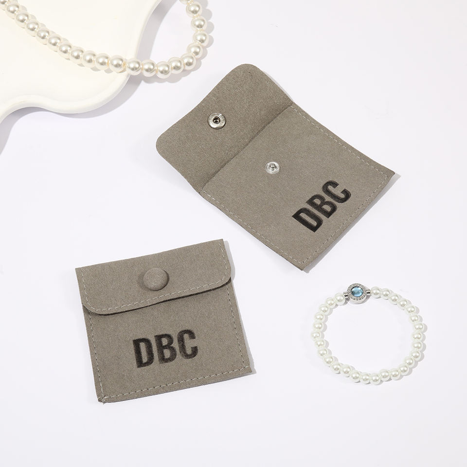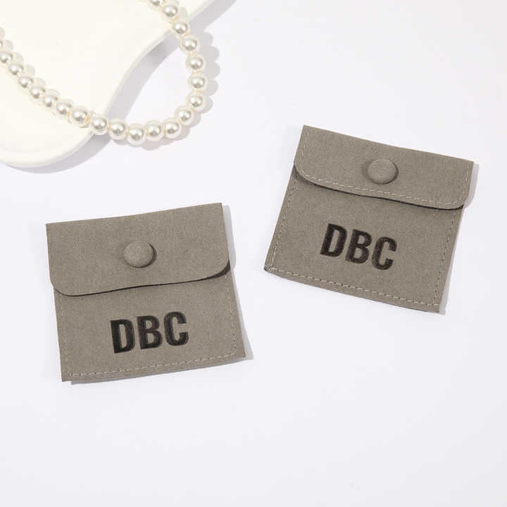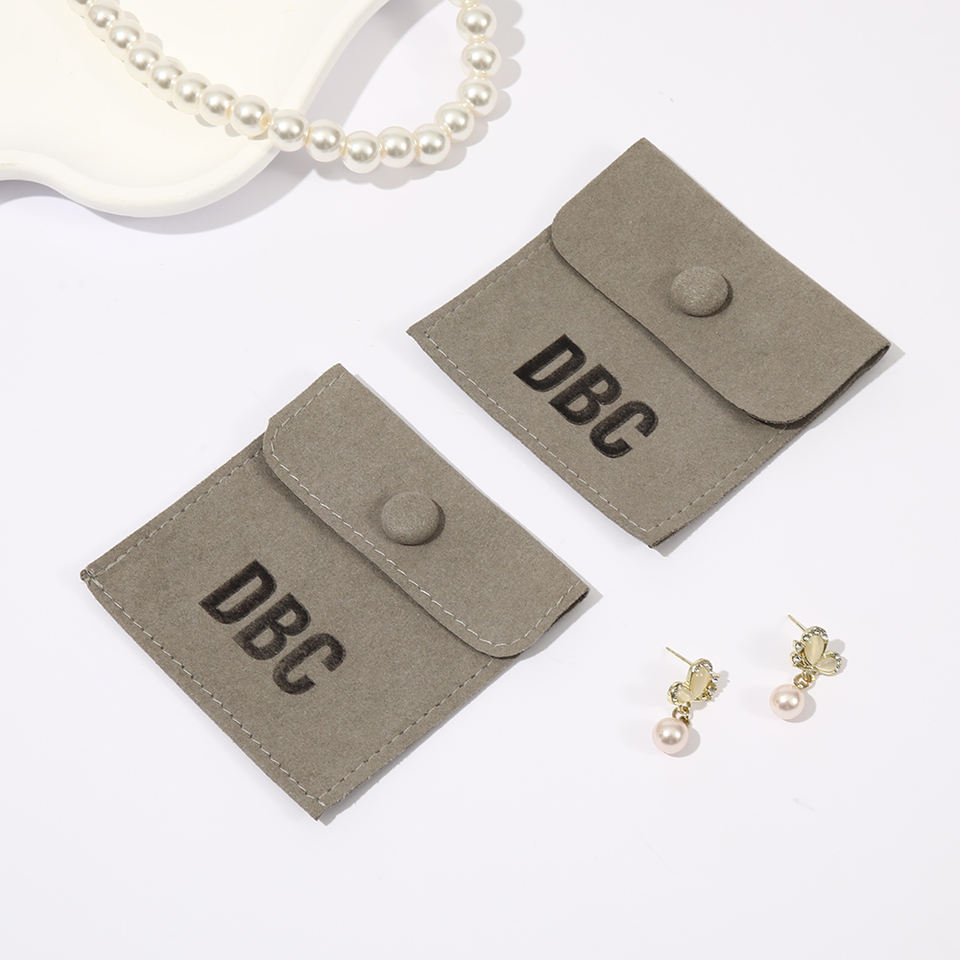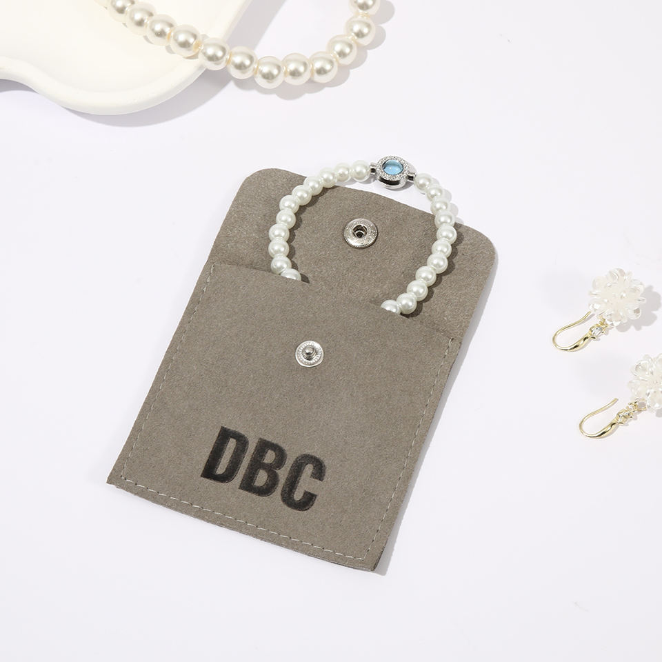 Pochette à bijoux personnalisée en microfibre grise avec bouton-pression, sac enveloppe doux pour bracelets, boucles d'oreilles et colliers