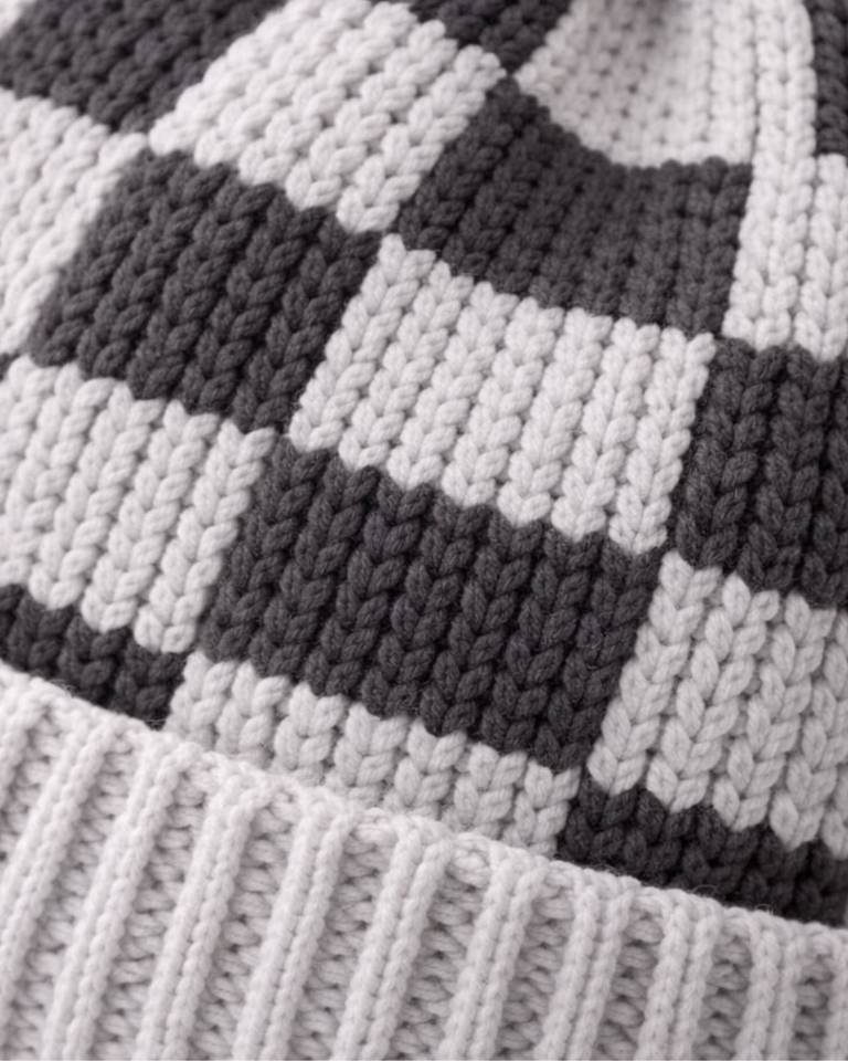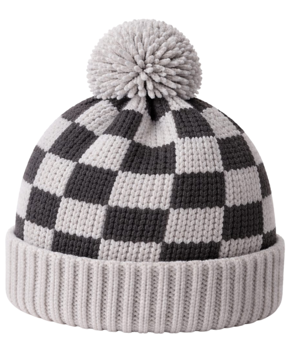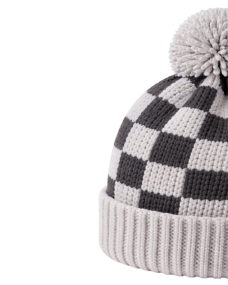Bonnet en tricot à carreaux gris et blanc personnalisé, chaud pour l'hiver, avec pompon, unisexe, bonnet épais tricoté, logo personnalisé, fournisseur OEM