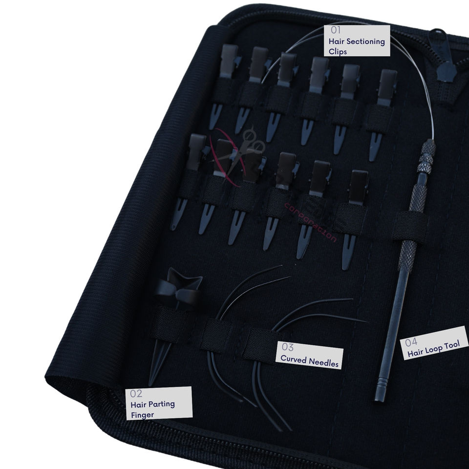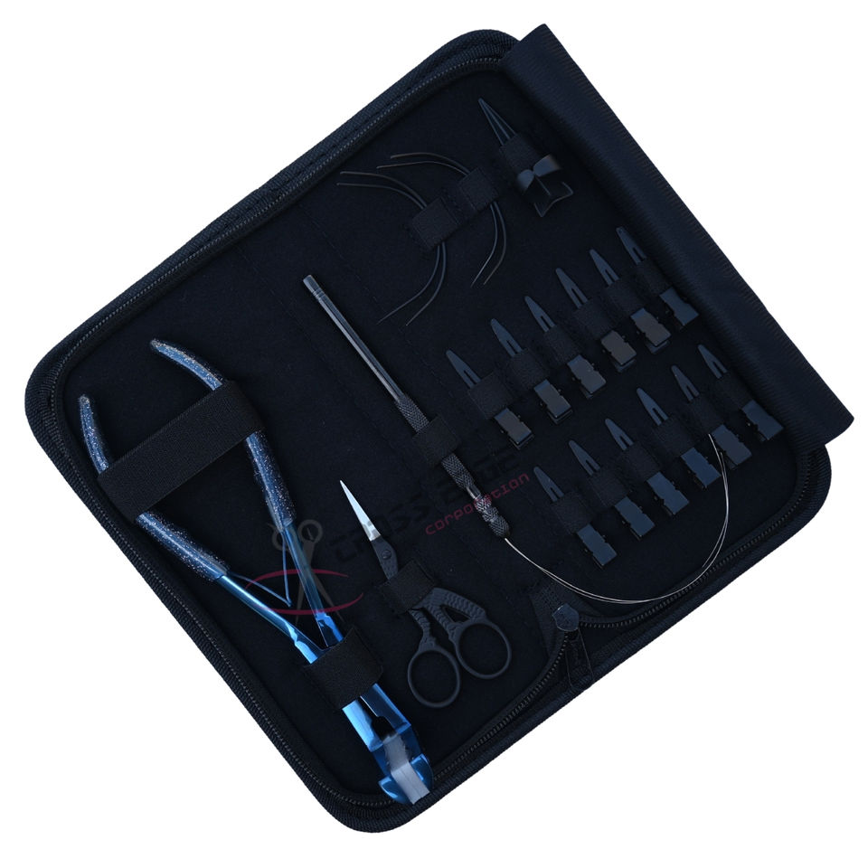 Kit d'outils et accessoires pour extensions capillaires personnalisées : Pince à bandes bleues, Outil à boucles, Mini ciseaux, Pinces de séparation à bec de canard