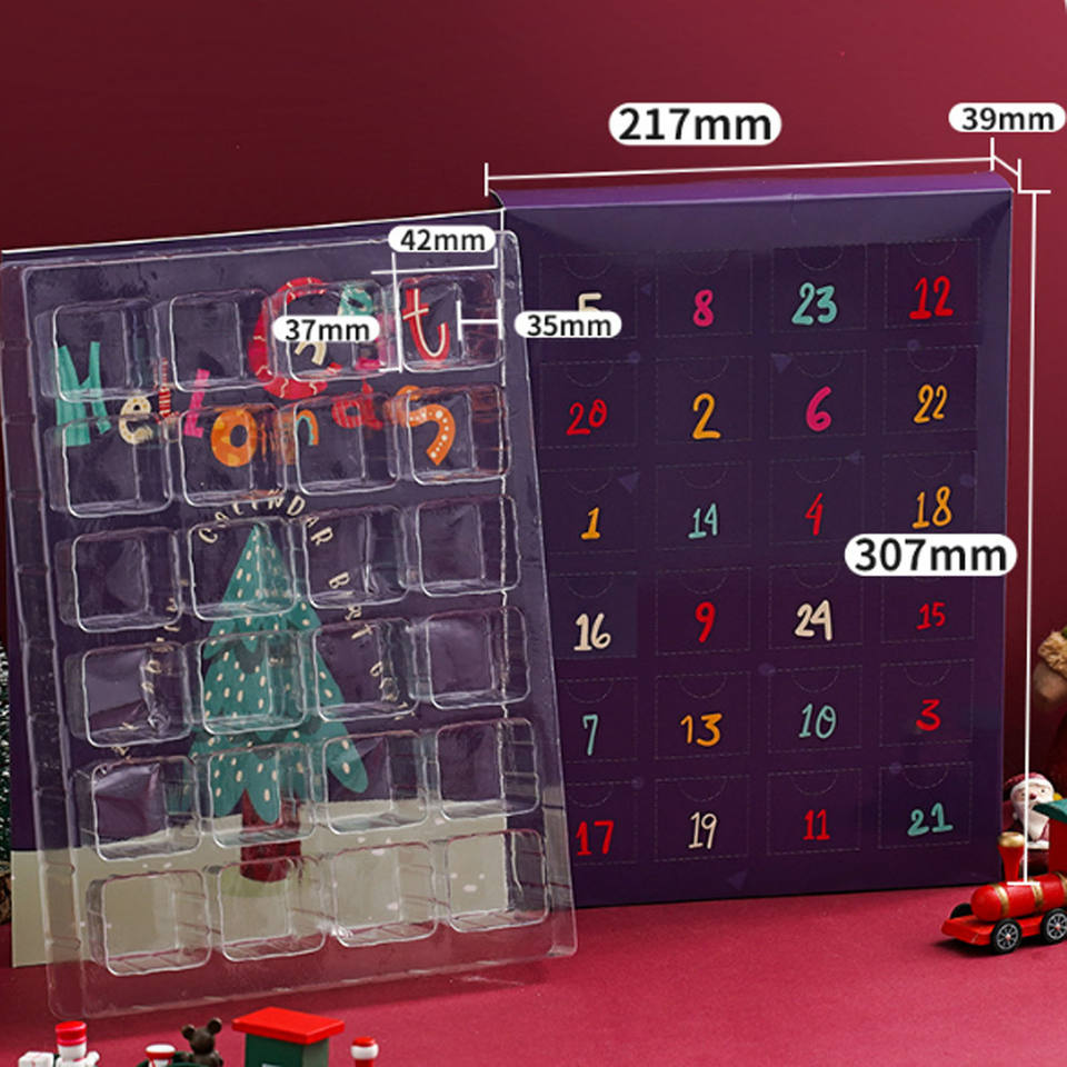 Boîte de calendrier de l'avent en papier aveugle surprise Halloween Noël Pâques compte à rebours 24 pièces avec plateau en plastique transparent