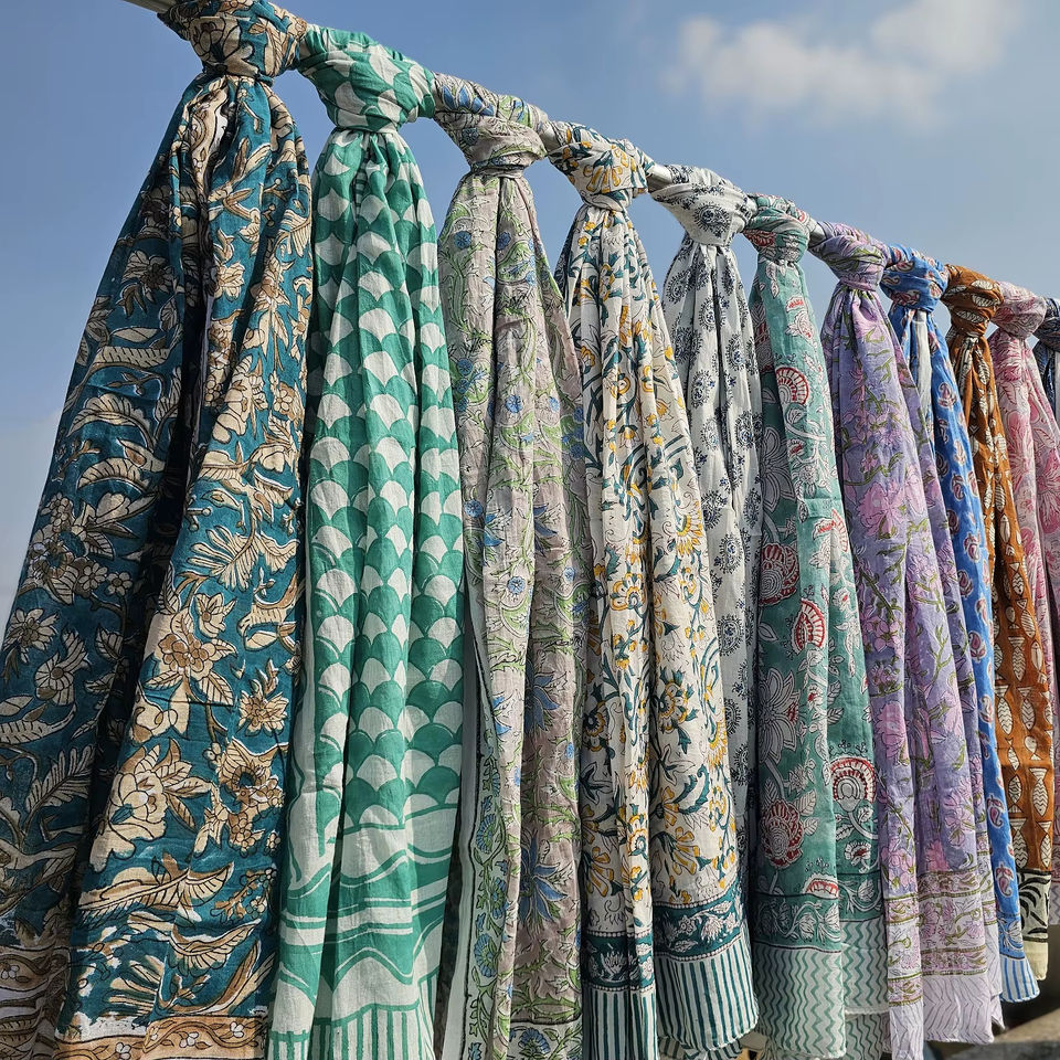 Sarongs, paréos et foulards imprimés en Inde, faits main avec des blocs de bois imprimés.