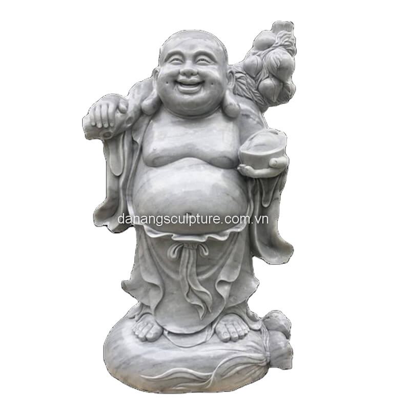 Grande statue debout de Bouddha heureux en marbre sculpté à la main sur mesure-Sculpté à la main à partir de marbre gris naturel massif