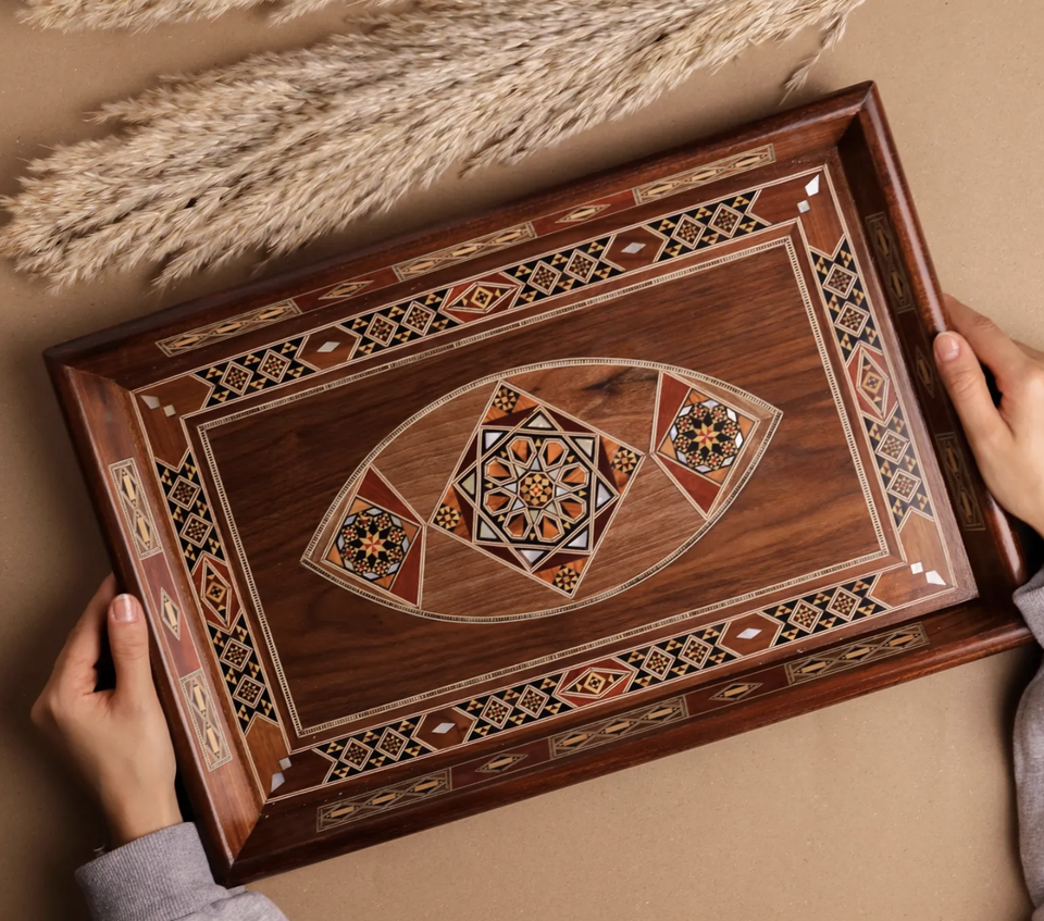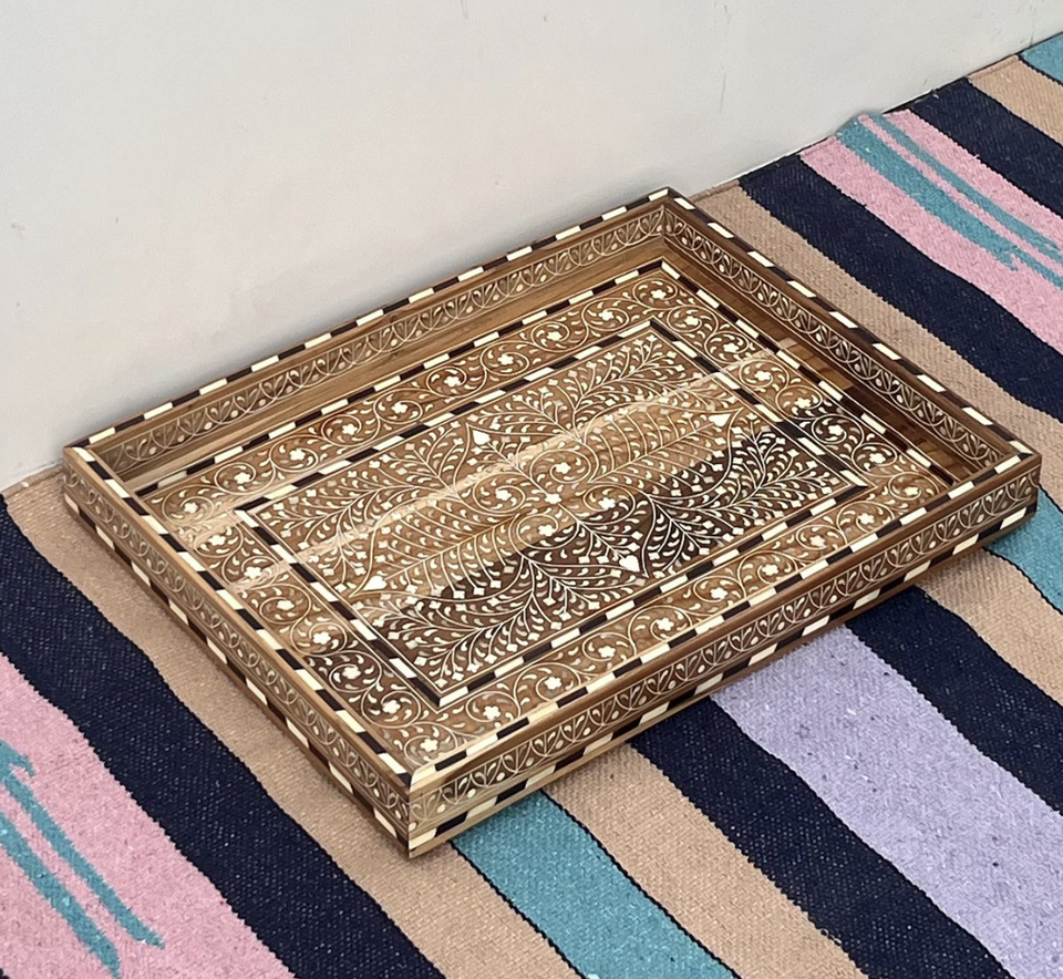 Plateau de service en bois rectangulaire sculpté à la main sur mesure Design unique motif de couleur de lavage blanc brûlé Poignées à usage domestique Vente en usine