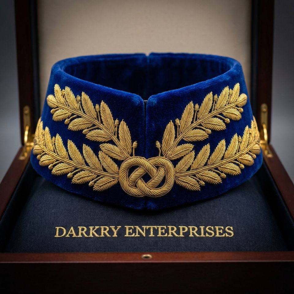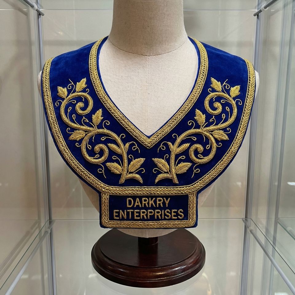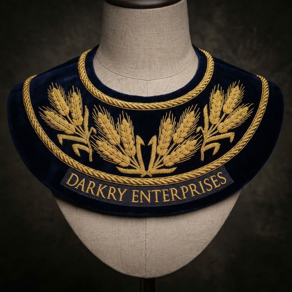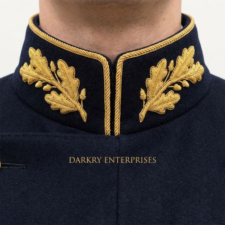 Service de personnalisation de vêtements sur mesure : broderie artisanale en or massif, col en laine bleu marine, motif nœud de blé, fabricant de vêtements sur mesure