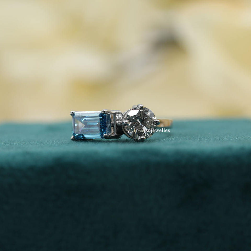 Bague de fiançailles personnalisée faite à la main en or massif 14KT certifiée IGI diamant de laboratoire taille ronde émeraude avec deux pierres de style tendance