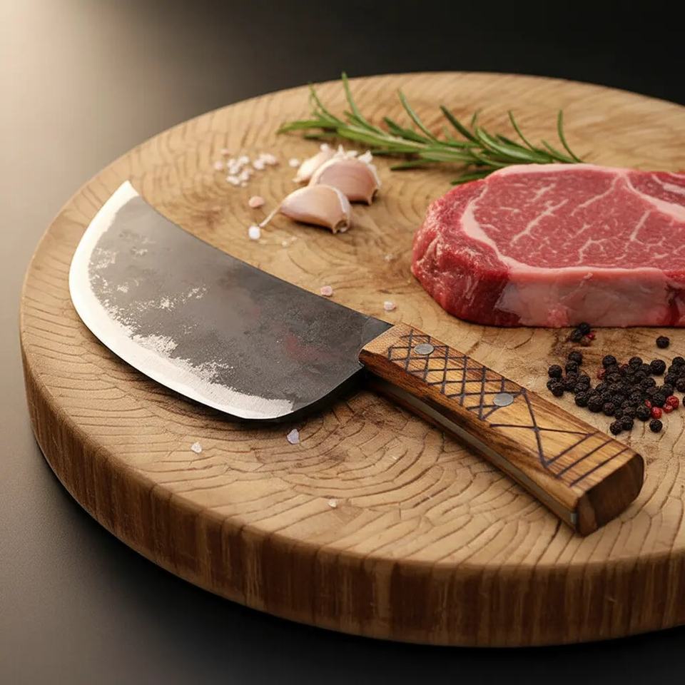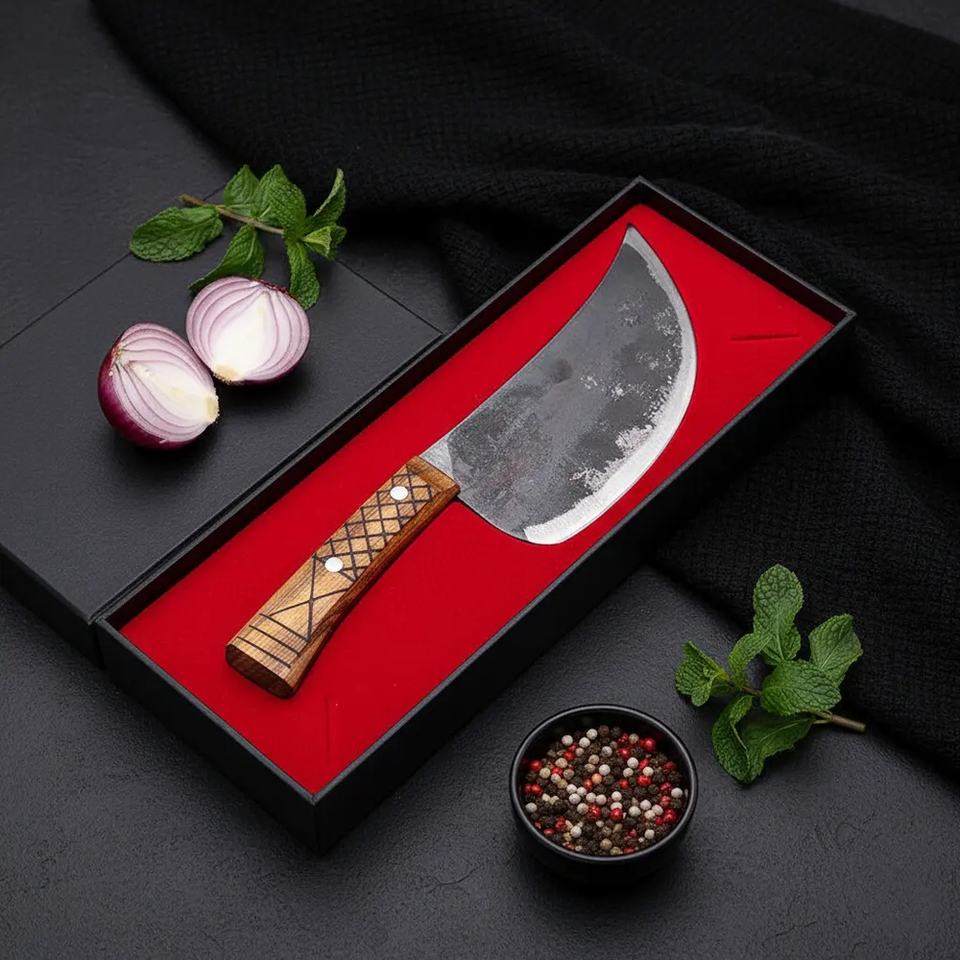 Couteau de chef multifonctionnel artisanal en acier inoxydable de 9 pouces avec manche en bois et étui en cuir, personnalisable OEM