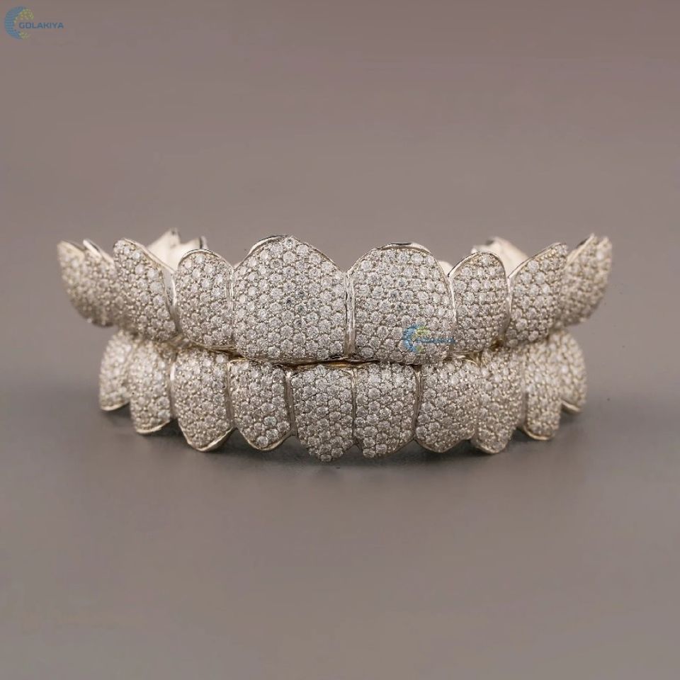 Grillz Hip Hop personnalisés faits à la main avec diamants de laboratoire couleur D en or blanc 14K, entièrement sertis