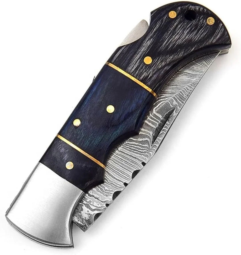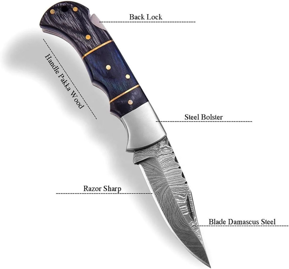 Couteau de poche à verrouillage arrière en acier Damas fait main sur mesure avec manche en bois et étui en cuir fin, couteau de camping, couteau de pêche