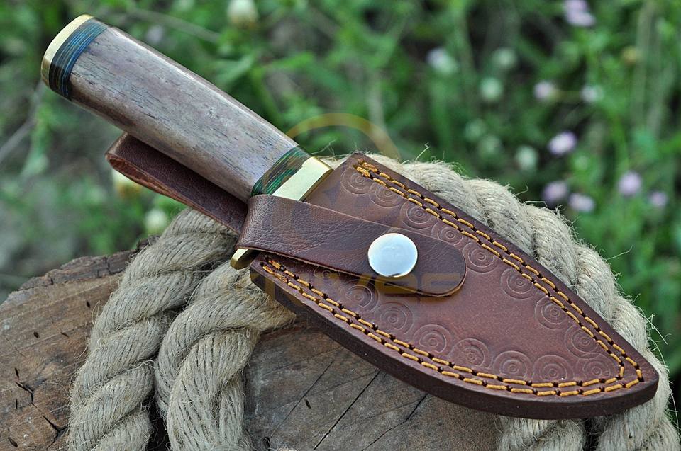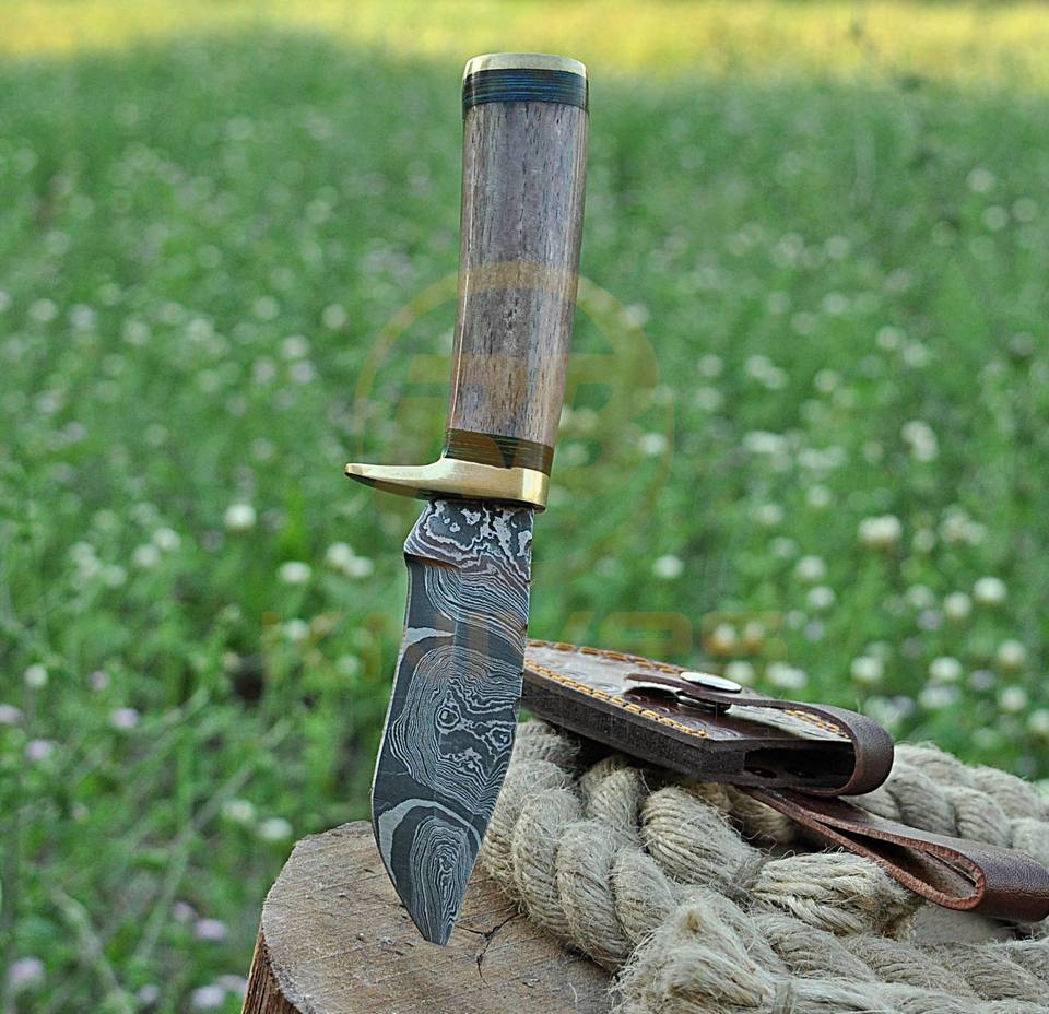 Couteau de chasse artisanal en acier Damas avec manche en bois et étui en cuir – Couteau de survie plein fil à lame pleine pour le camping en extérieur