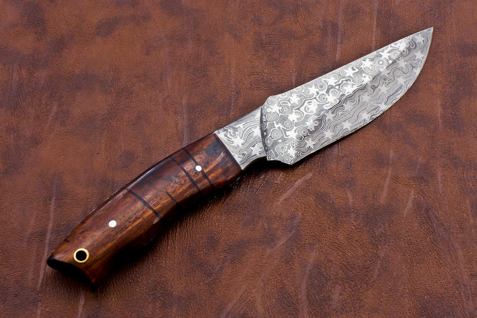 Couteau de skinner en acier damas fait à la main personnalisé avec manche en bois de rose belle gaine en cuir de qualité EDC supportée OEM