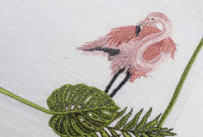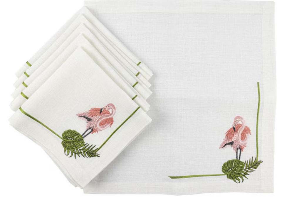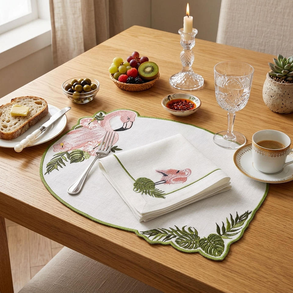 Ensembles de serviettes et sets de table ovales en lin blanc, brodés à la main, motif flamants roses et feuilles, lavables, pour mariages et événements à domicile