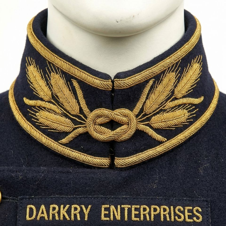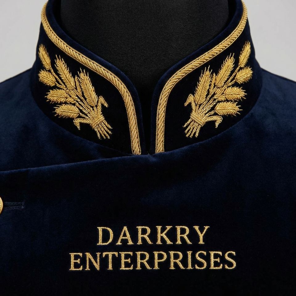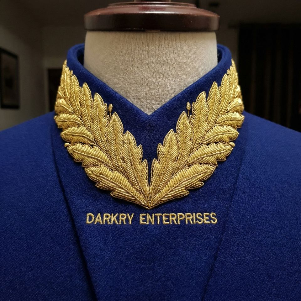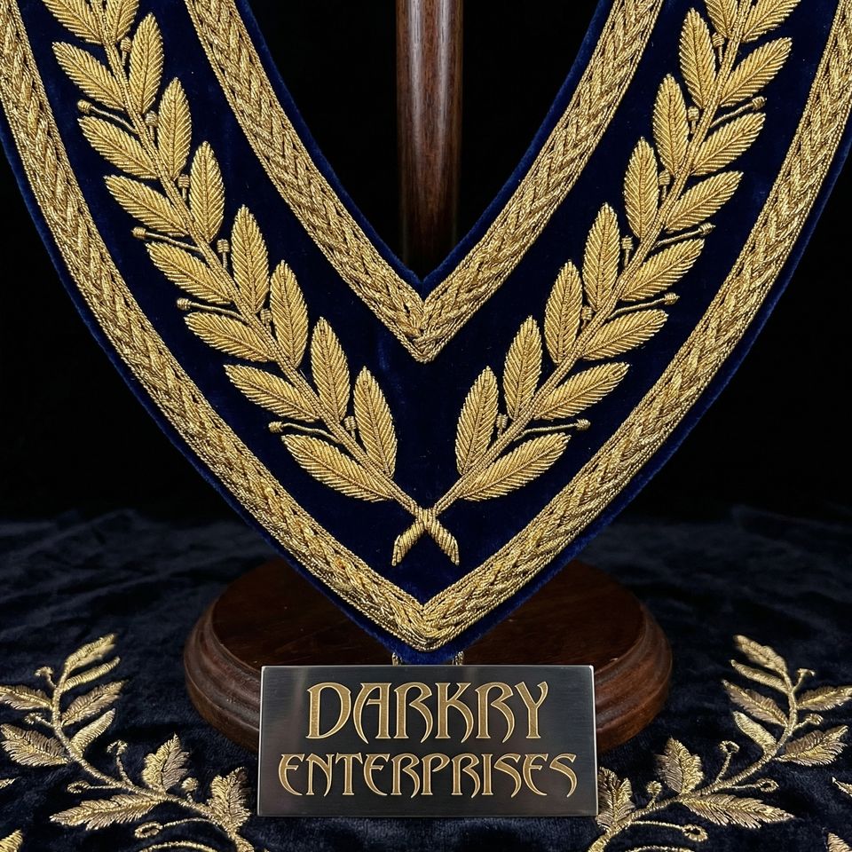 Service de Fabrication Sur Mesure de Régalia de Luxe en Velours Bleu Royal avec Broderie Artisanale en Lingots d'Or et Col Montant