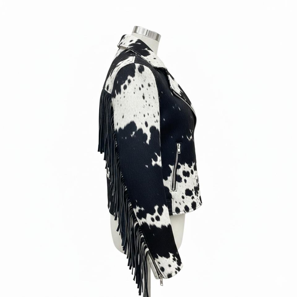 Veste en cuir de vachette faite à la main avec design en fourrure, pour femmes, de haute qualité, style motard, inspiration western, avec franges