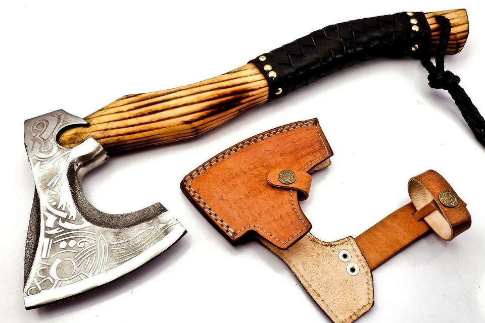 Tomahawk Viking artisanal en acier à haute teneur en carbone, multi-usage, qualité industrielle, avec fourreau en cuir et manche en acier, lame de 3,8 pouces