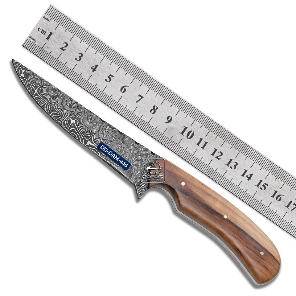 Couteau de chasse fait main avec lame en acier damas DD-DAM-444 personnalisable OEM gaine en cuir gaufré manche en bois d'olivier