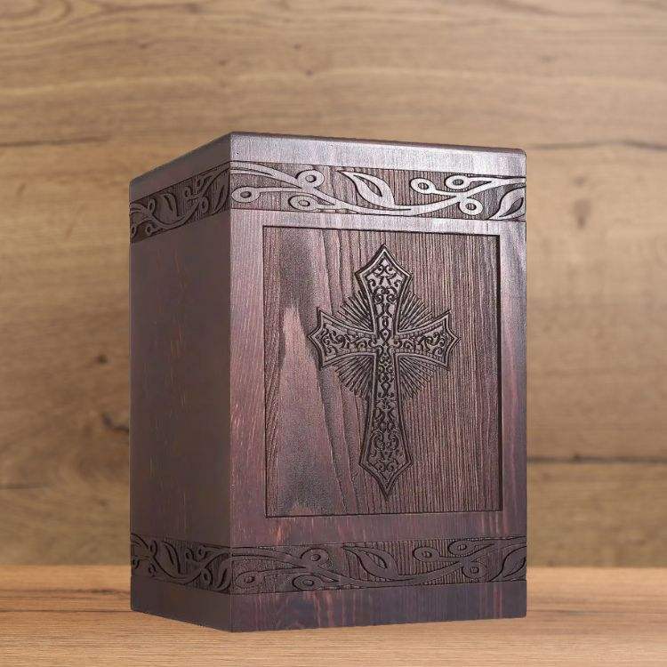 Custom Handmade Luxury Carved Wooden Urn with Brass Inlay for Human Pet Ashes European Cross Design Eco-Friendly Cat Dog Urn