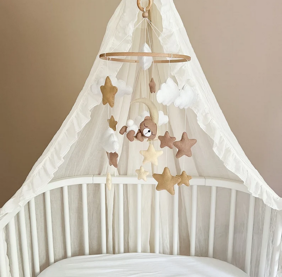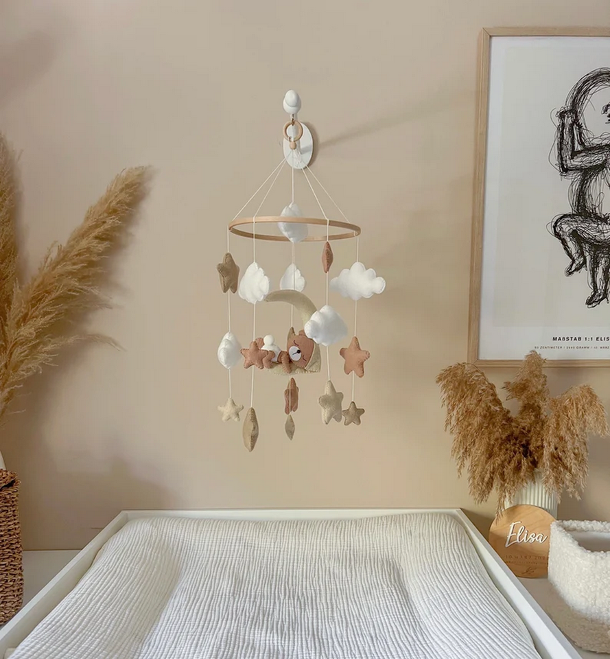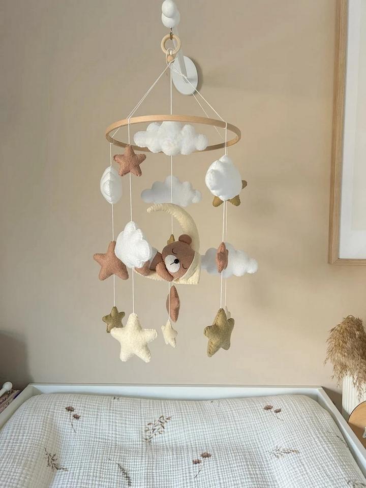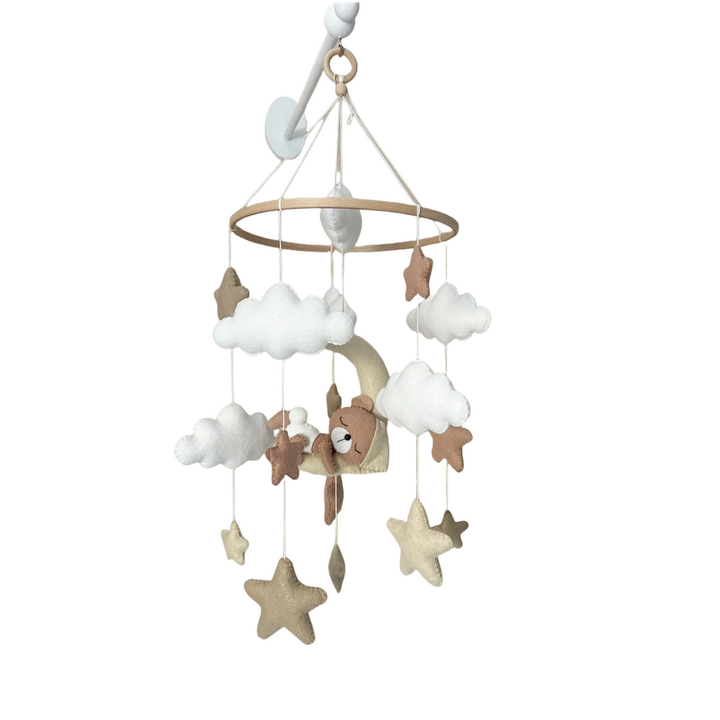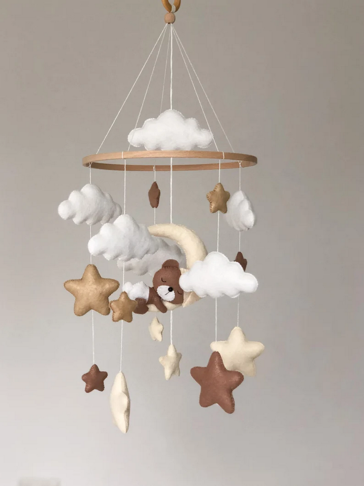 Custom Handmade Neutral Sleeping Bear Felt Baby Mobile with Moon Star Cloud for Baby Birth Shower Gift