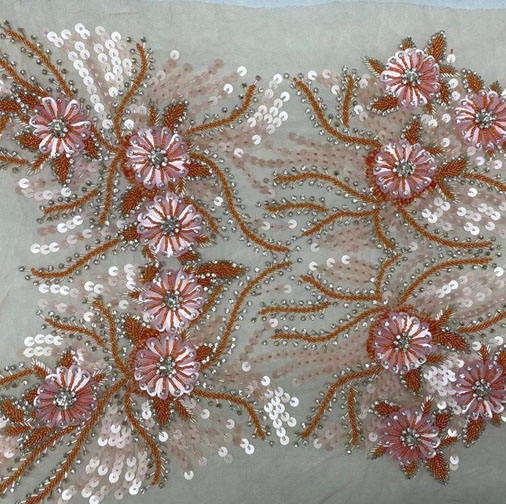 Tissu brodé personnalisé fait main en dentelle de maille rose avec fleurs 3D, perles, strass et sequins élégants pour robes de mariée et décorations de mariage