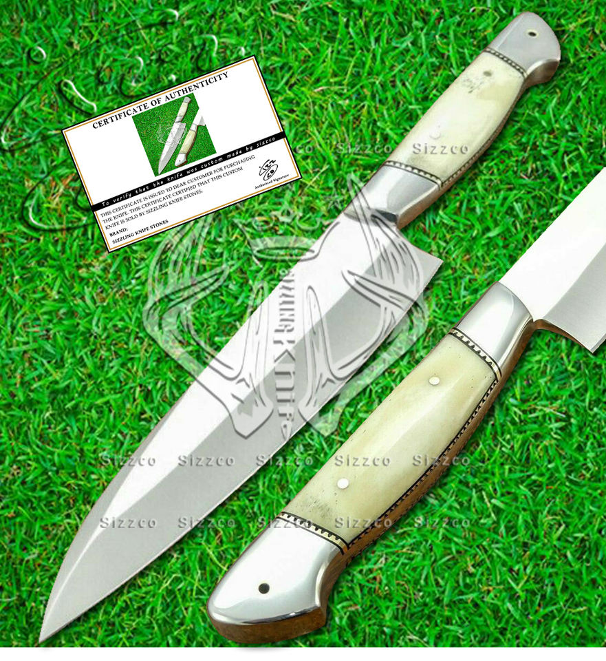 Couteau de chef de cuisine professionnel fait à la main personnalisé chasse Camping D2 couteau à lame en acier, manche en os étui en cuir, cadeau idéal