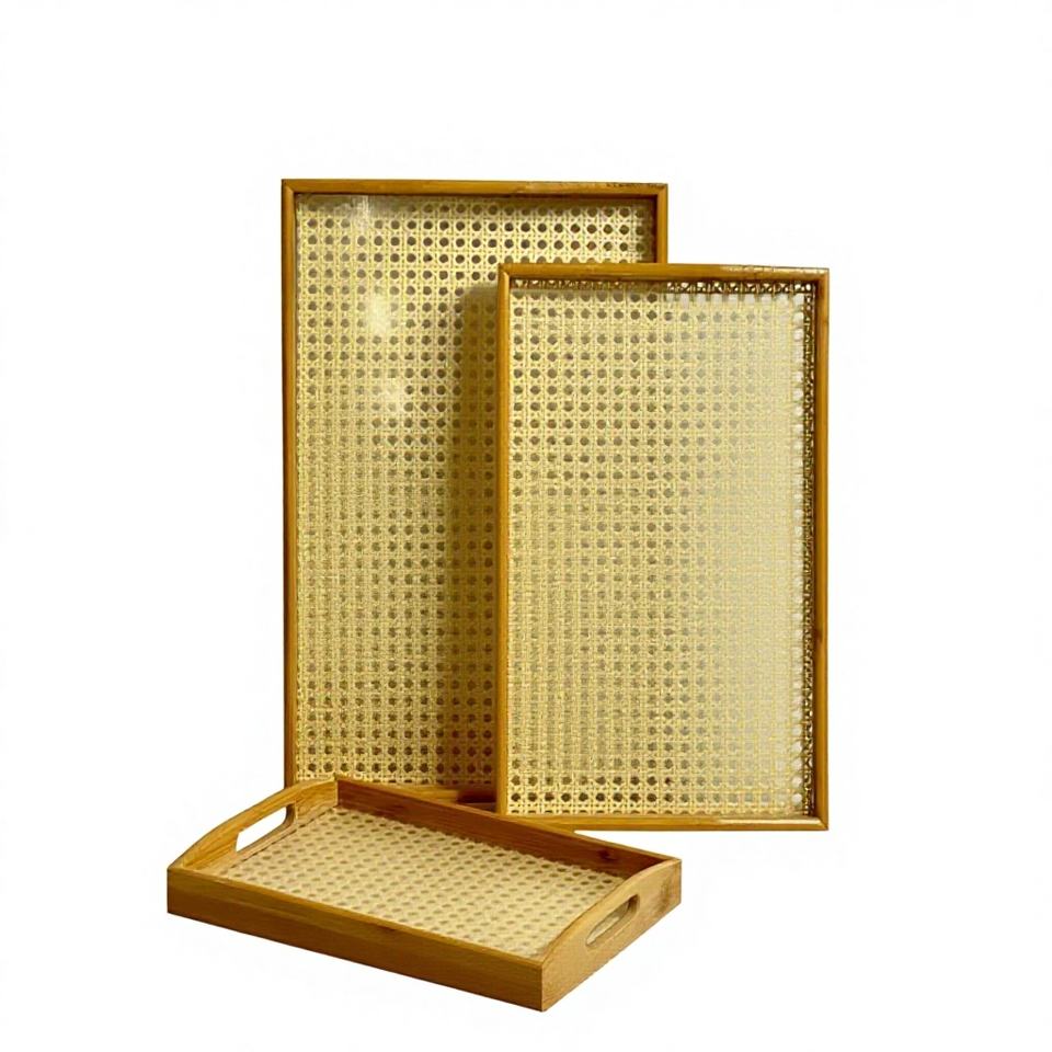 Plateau de service rectangulaire en bois d'acacia et rotin, fait main en Inde, avec poignées, pour la cuisine, exportations Craftera.