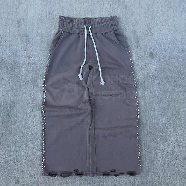 Pantalon de survêtement décontracté pour homme en coton épais respirant, coupe droite, jambe large, effet empilé, délavé à l'acide, effet délavé par le soleil, ample, avec strass