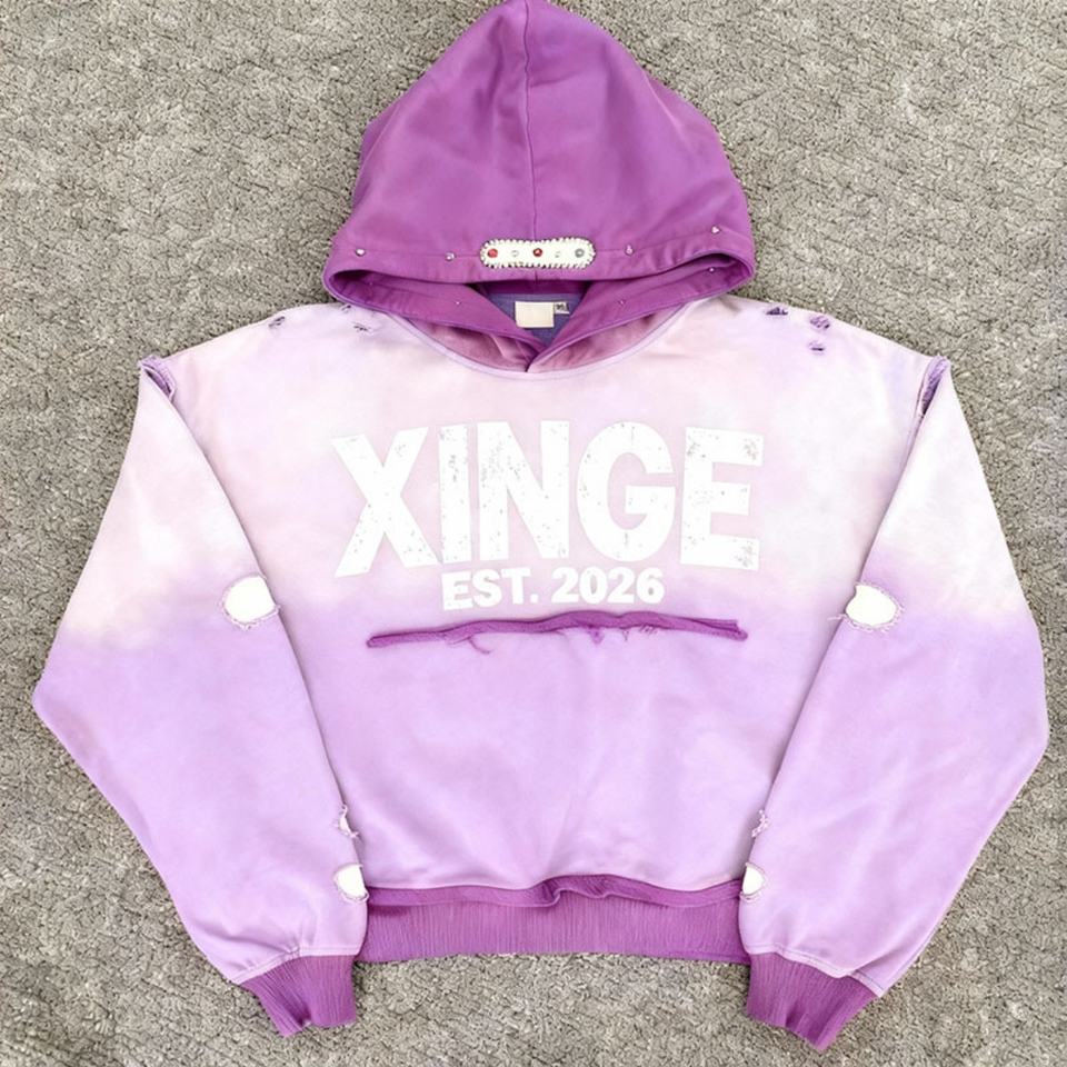 Sweat à capuche pour homme personnalisé, coupe ample et courte, épais 400 g/m², délavé à l'acide, avec trous usés, imprimé strass style streetwear et épaules tombantes