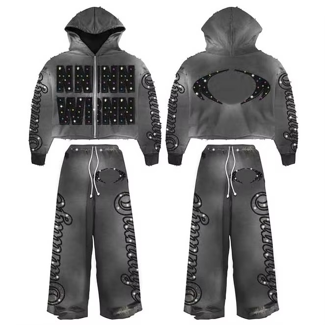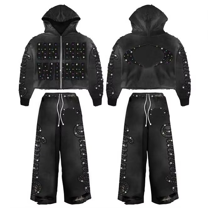 Ensemble survêtement homme personnalisé, coupe évasée, effet délavé à l'acide, broderie streetwear, avec sweat à capuche et pantalon de survêtement court orné de strass