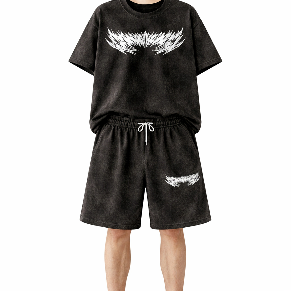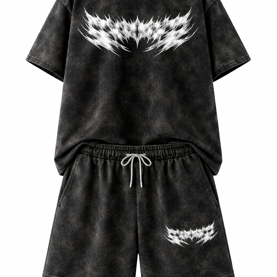 Ensemble coordonné streetwear été en molleton bouclette épais respirant, coupe oversize, avec t-shirt et short imprimés délavés effet soleil