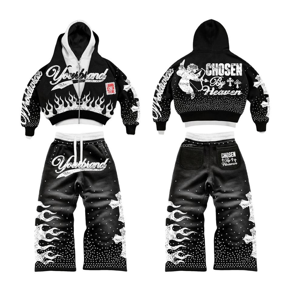 Ensemble survêtement personnalisé lourd, style boxy, imprimé intégral, avec strass, délavé à l'acide, pantalon de survêtement évasé et sweat-shirt pour homme