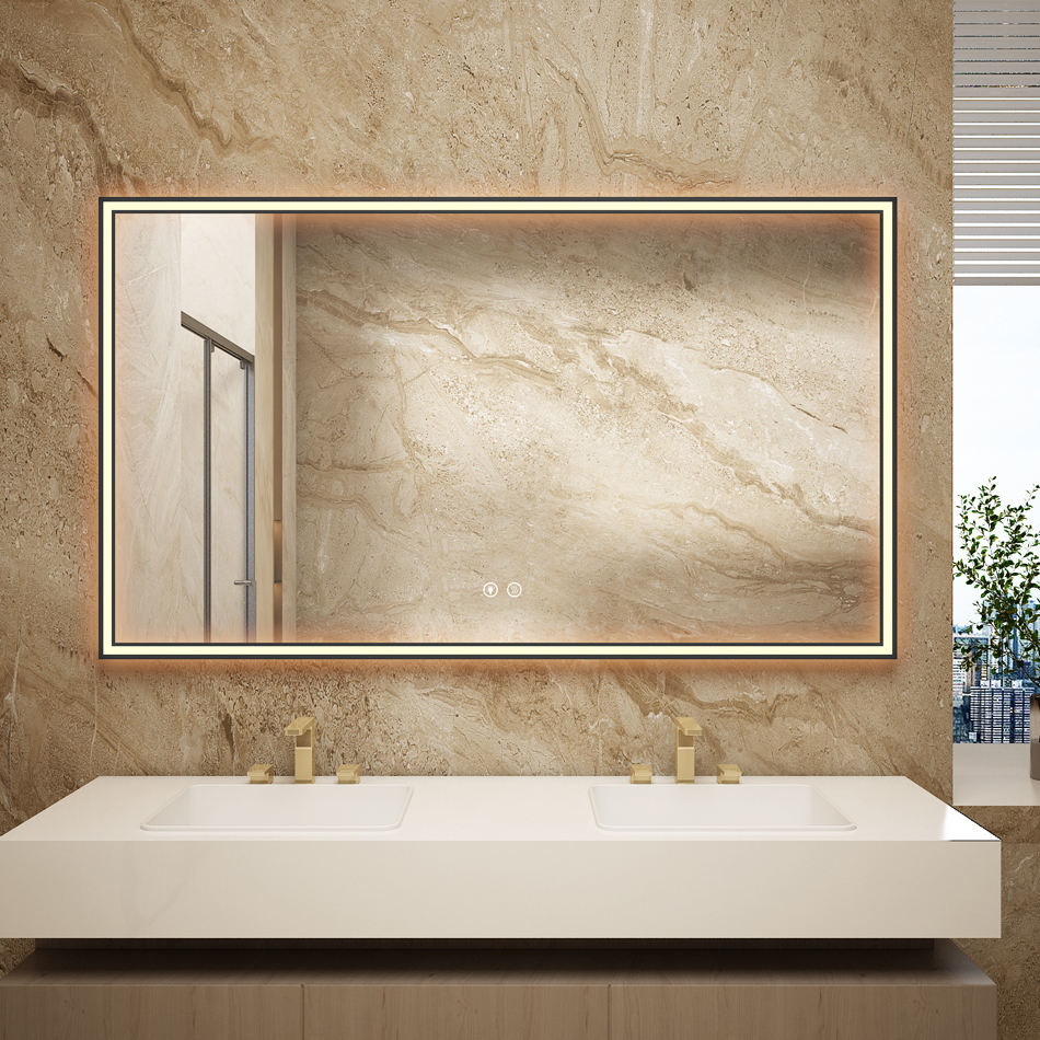Miroir décoratif de salle de bain d'hôtel haut de gamme personnalisé étanche miroir LED moderne avec cadre en laiton illuminé