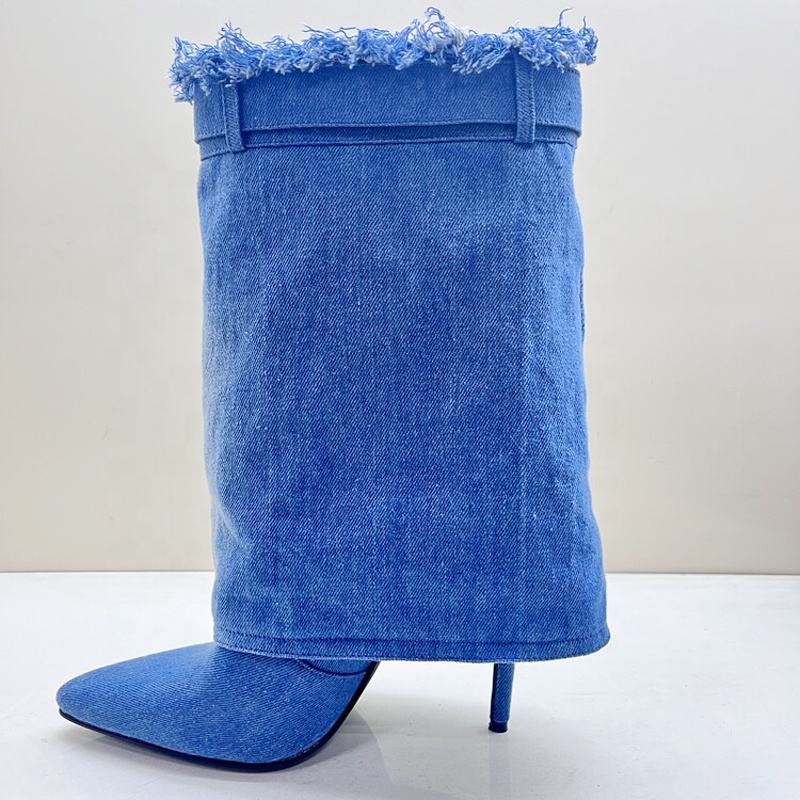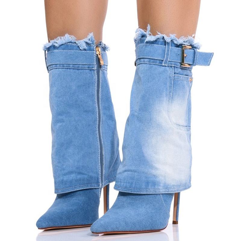 Bottines courtes personnalisées à franges en jean léger pour femme, talons aiguilles fins, avec boucles