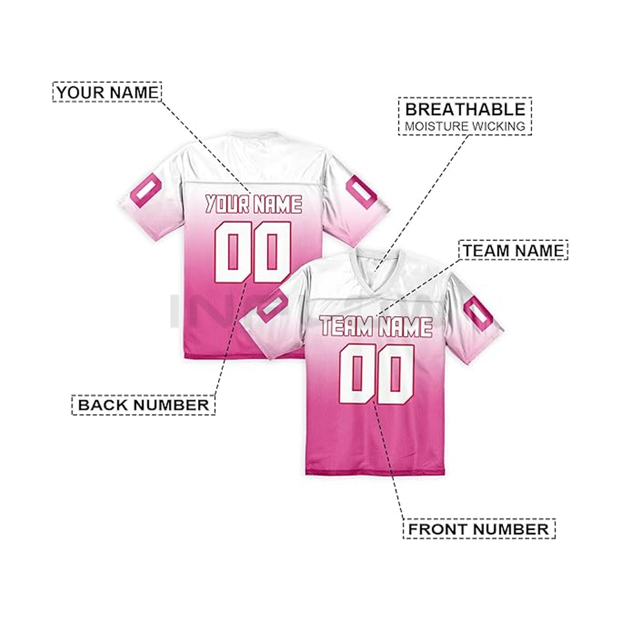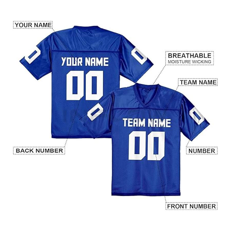 Maillot de football américain personnalisé de haute qualité en polyester 220g avec nom imprimé par transfert thermique sur le devant, taille plus, haut court