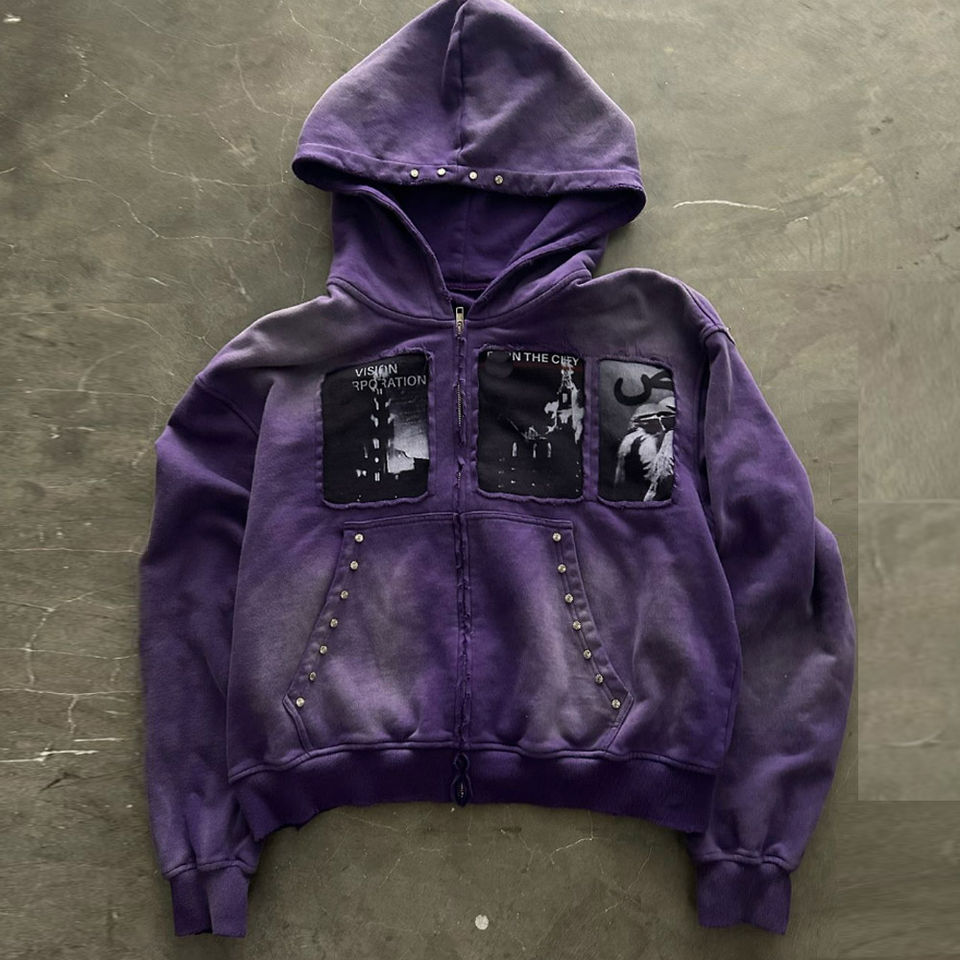 Personnalisé de Haute Qualité Graphique Surdimensionné Coton Strass Distressed Hoodies Zip Up Cropped Hoodie Hommes Fabricants