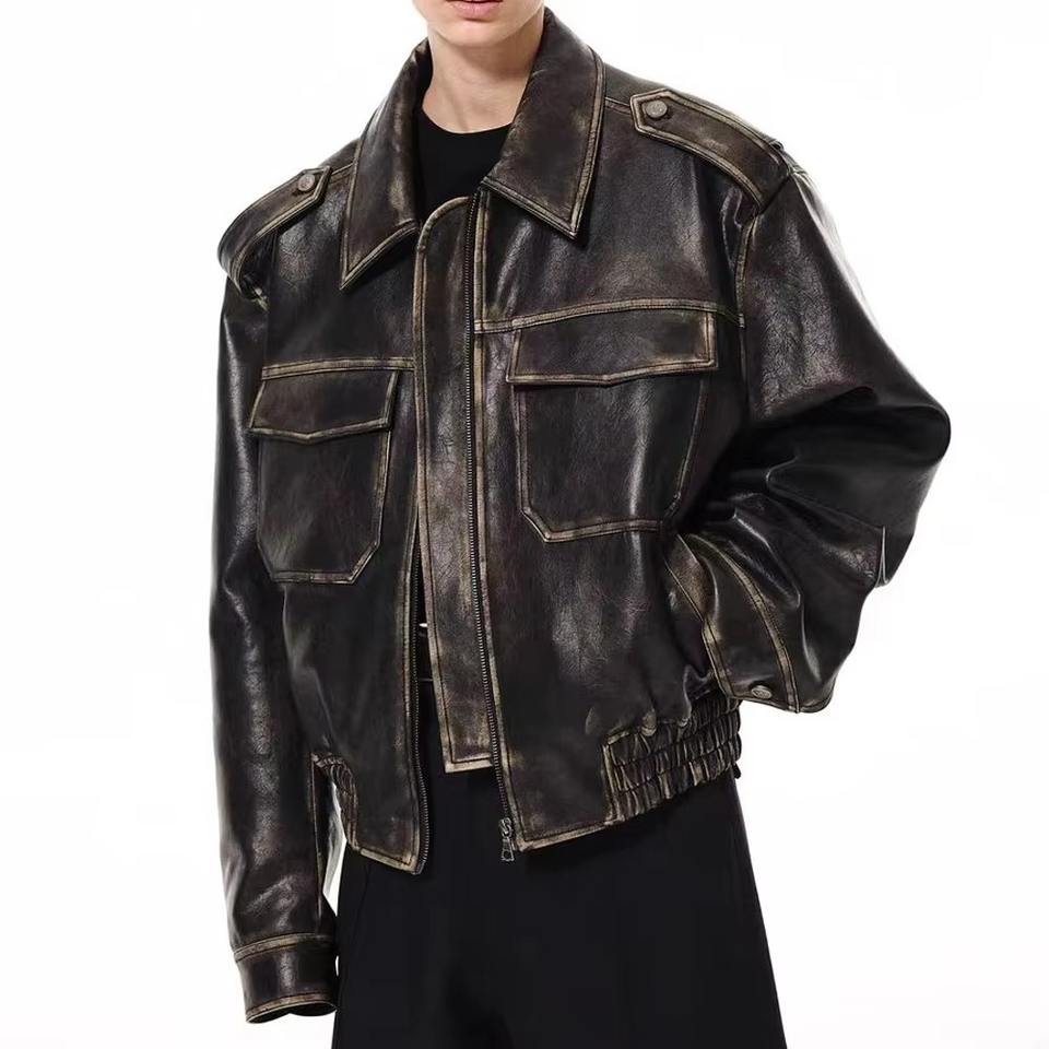 Veste d'hiver personnalisée de haute qualité pour hommes coupe-vent en cuir et polyester délavés avec motif en relief 3D