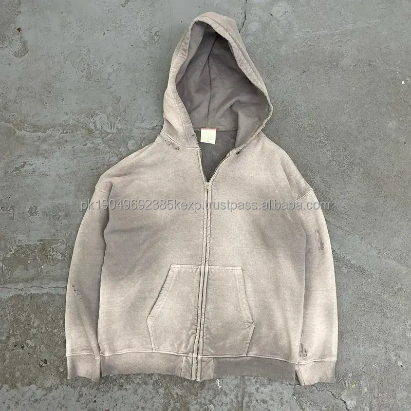 Custom High Quality Streetwear Hoodie Fleece Blank Zip up Vintage Double Layer Acid Wash Sun Faded Distressed Pockets Hoodies
