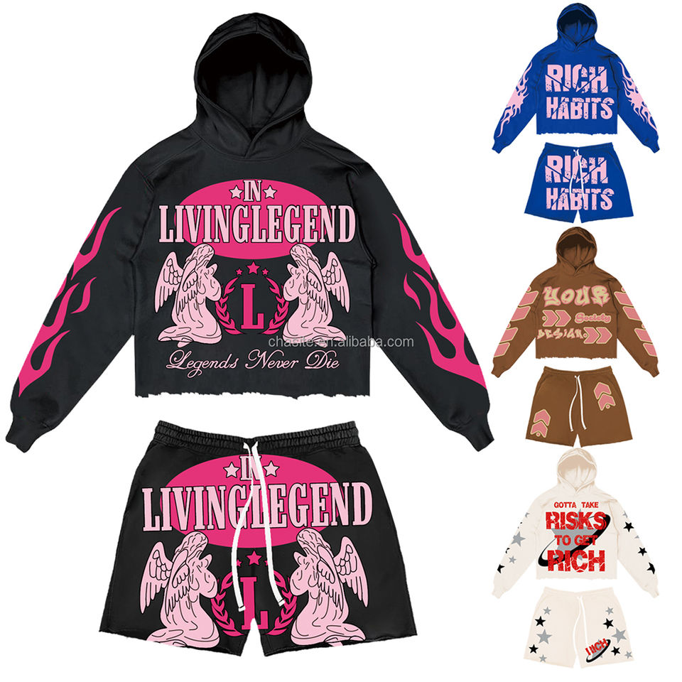 Ensemble de survêtement homme personnalisé de haute qualité, effet délavé soleil, avec broderie vieillie, comprenant un sweat à capuche et un short, et un ensemble sweat à capuche d'hiver à double fermeture éclair