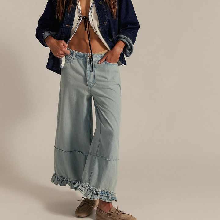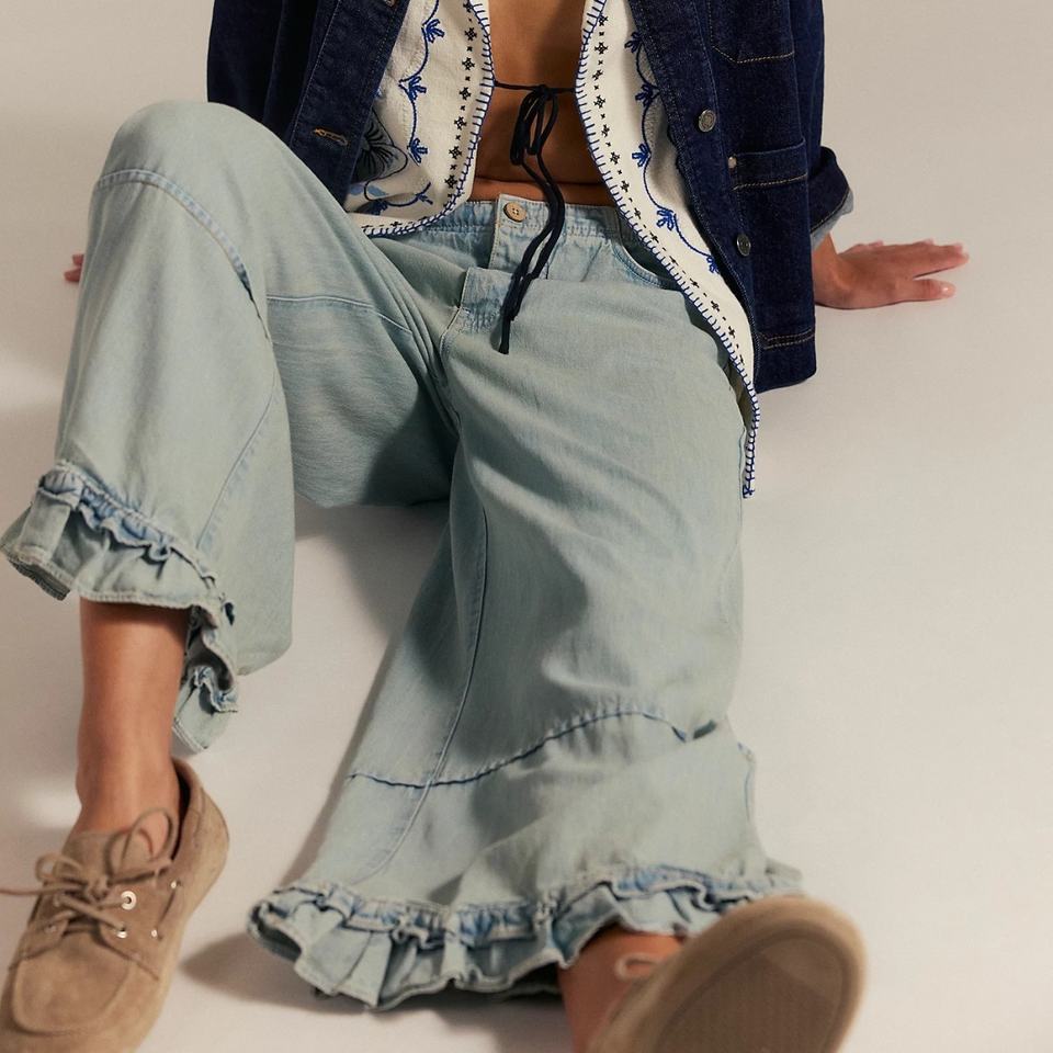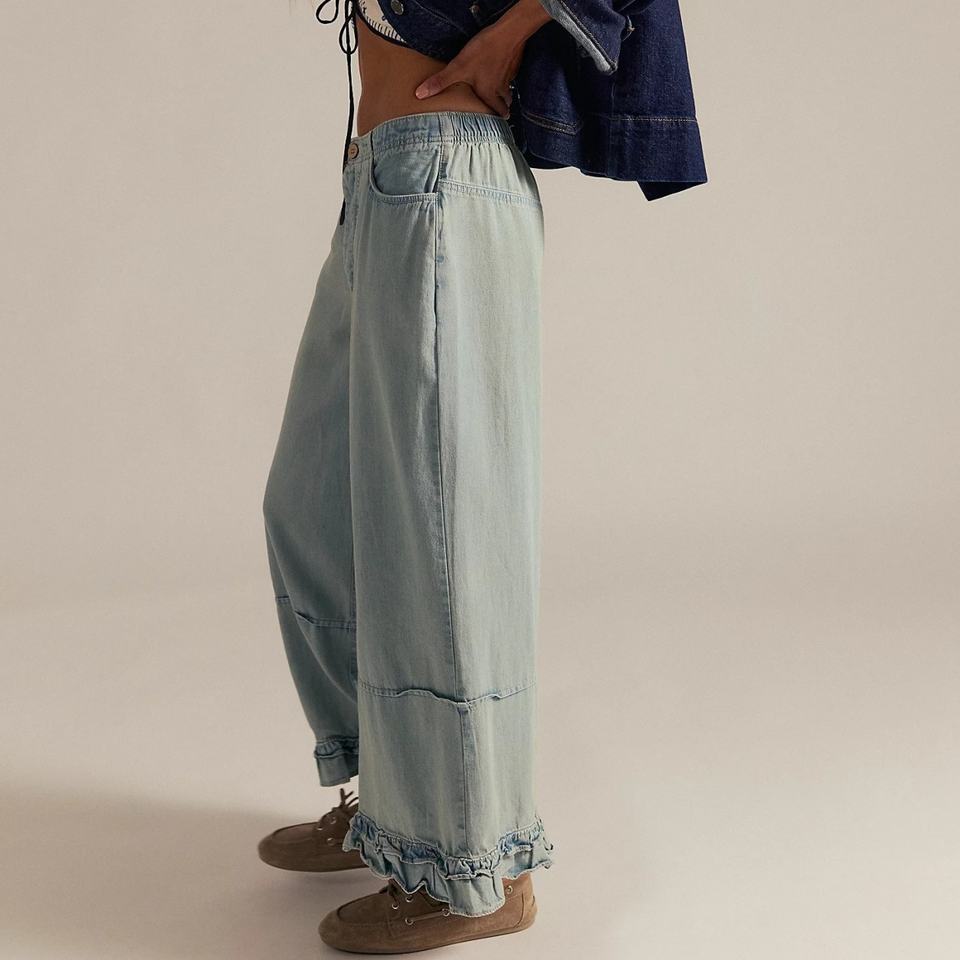 Jeans en denim délavé décontracté de haute qualité pour femme, coupe baggy à jambe large et ourlet volanté, idéal pour les vacances