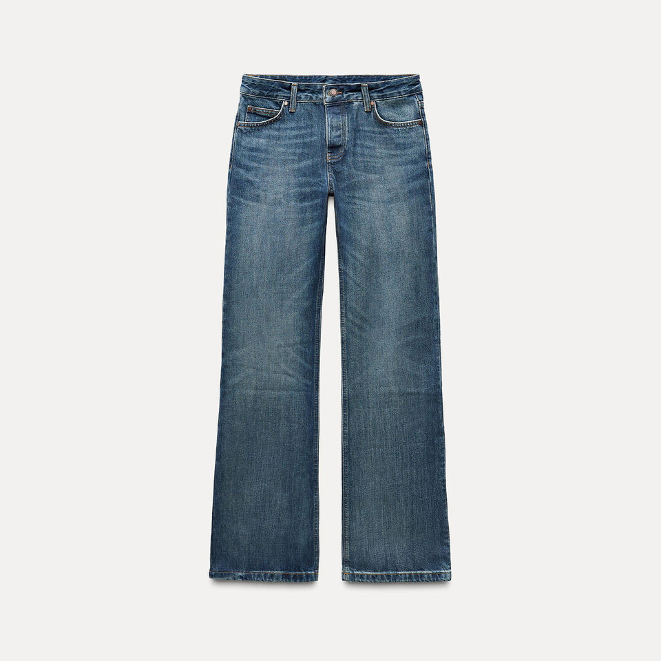 Jean bleu glace à jambe droite fendue et détaillée au laser sur le devant