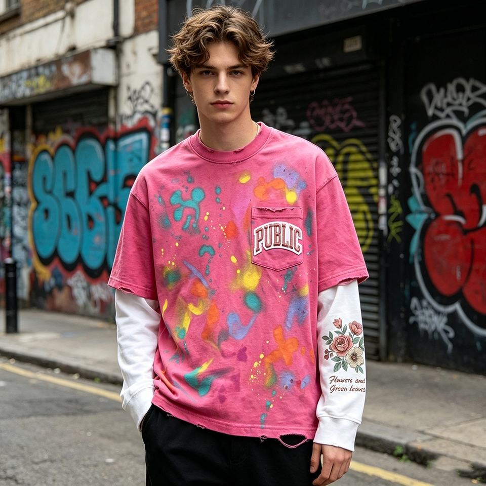 T-shirt à manches longues pour homme, personnalisé, avec motifs graphiques, patchwork, effet vieilli, broderie 3D, impression numérique, double couche, style décontracté