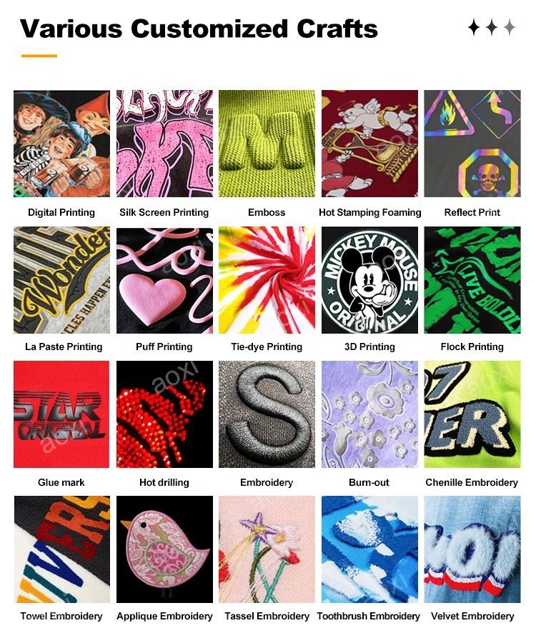 Méthodes d'impression:Tie-dye, Impression Puff, EMBOSSÉ, Impression de Chaleur-transfert, Impression numérique, Impression par pulvérisation, IMPRESSION D'ÉCRAN DE SOIE, DRIPPING