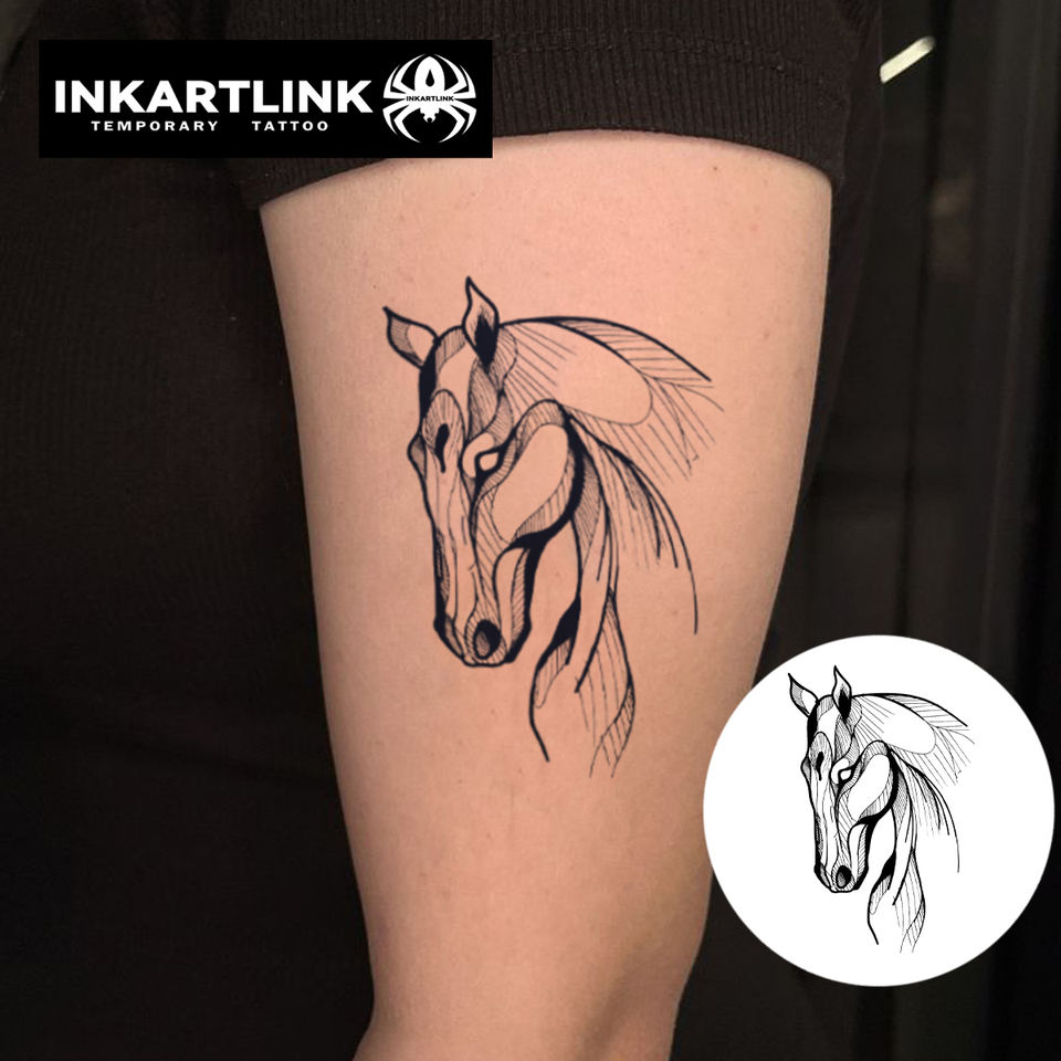 Autocollant Tatouage Personnalisé Tête de Cheval, Art Linéaire Géométrique Minimaliste, Motif Herbal, Semi-permanent 15 Jours, Art Corporel pour Bras et Épaule, Vente en Gros