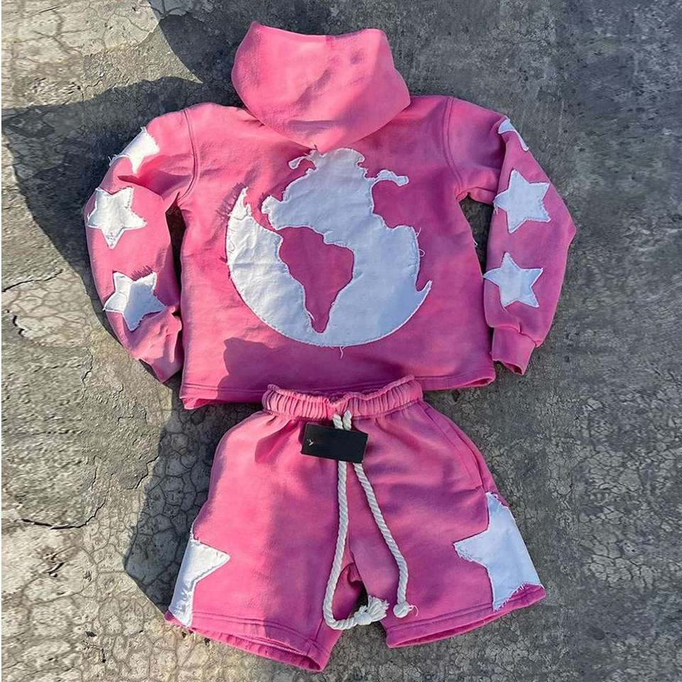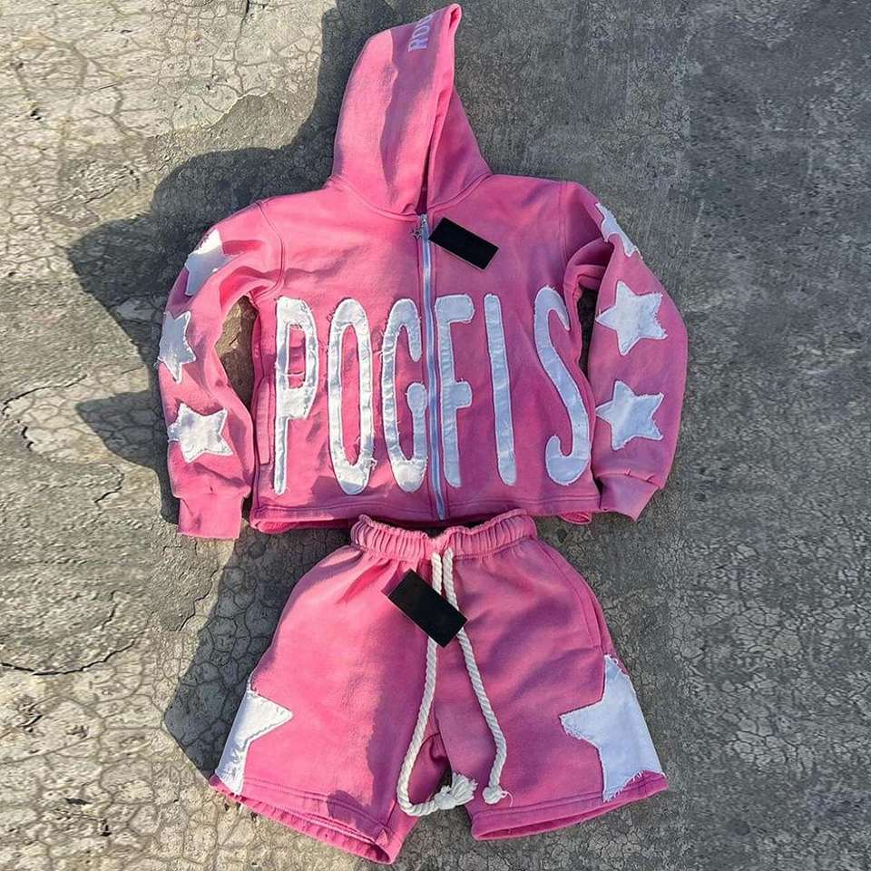 Ensemble de survêtements personnalisés à fermeture éclair, style déchiré, avec patchs et délavage acide, comprenant un sweat à capuche et un pantalon de survêtement, ou un short de survêtement, pour hommes et femmes