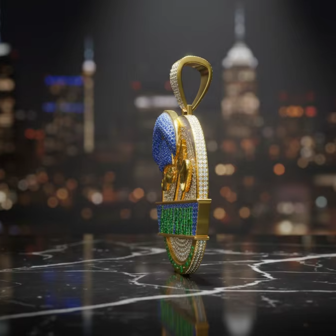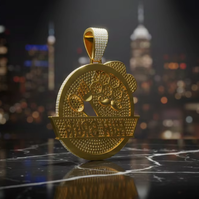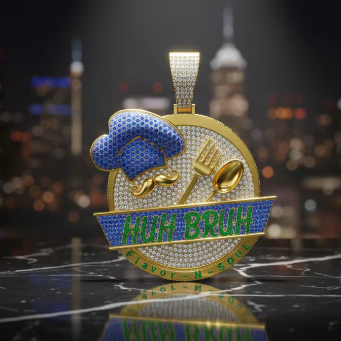 Pendentif circulaire personnalisé avec logo de chef, serti de diamants micro-pavés bleus et blancs, fabriqué à la main en or jaune 925.