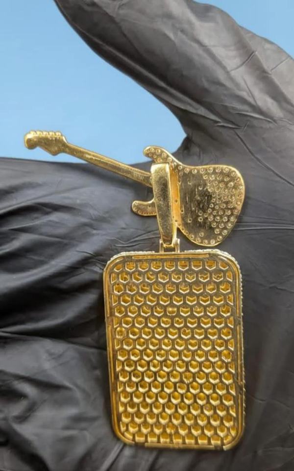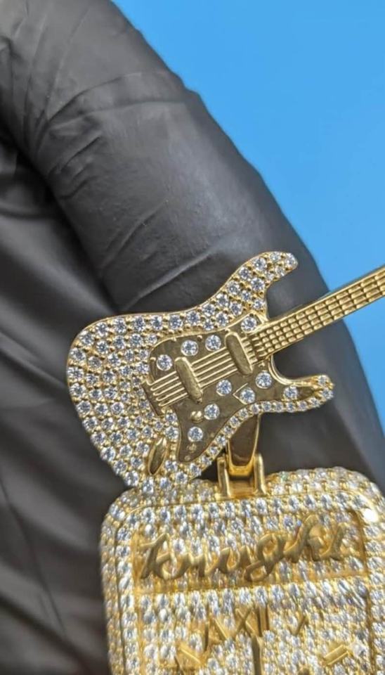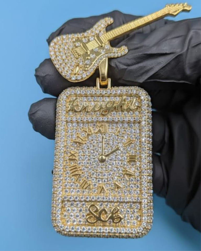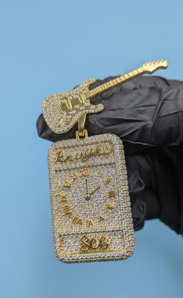 Pendentif personnalisé en argent 925, style horloge guitare, serti de moissanite, bicolore, avec nom et initiales personnalisés, pour rappeur, style hip-hop et bling