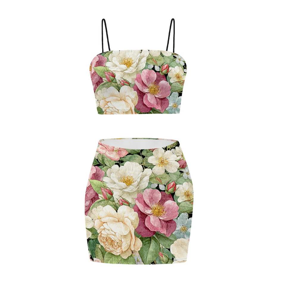 Ensemble deux pièces pour femme avec motif floral personnalisé, débardeur court et mini-jupe mi-longue, taille XS, longueur courte, 2 pièces