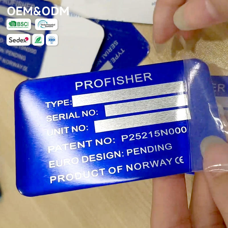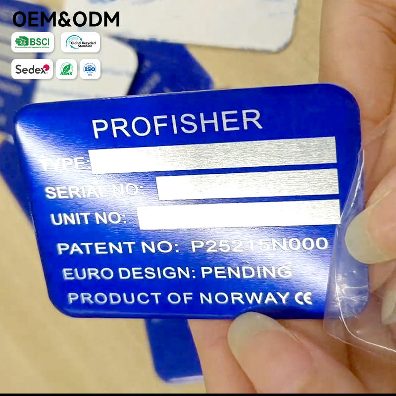 Plaques signalétiques métalliques adhésives en aluminium anodisé brossé bleu, sérigraphiées sur mesure, pour équipements industriels marins